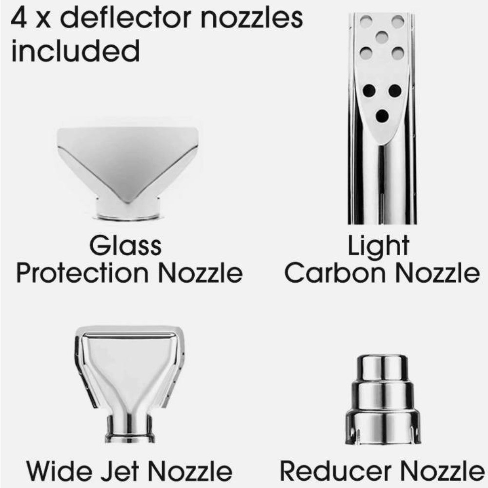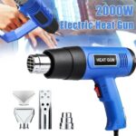 • **Produktname:** Hochleistungs-Heißluftpistole **Produktmerkmale:**– Der leistungsstarke 2000-Watt-Motor bietet ausreichend Kontrolle und Leistung für die meisten Aufgaben und ist robust genug für anspruchsvolle Profis.– Abnehmbarer Frontring für Arbeiten in engen Ecken und schwer zugänglichen Stellen.– Hochwertige Heizelemente sorgen für zuverlässigen und sicheren Betrieb.– Integrierter Aufhängering für einfache Wandmontage.- Geeignet zum Rohrschweißen, PVC-Schweißen, Trocknen, Schrumpfen, Entlacken usw. **Produktspezifikationen:**- Hervorragendes Trocknungsmittel- Zum Trocknen von Kleidung- Zum Trocknen von Farbe oder Kitt- Taut gefrorene Rohre auf- Entfernt selbstklebende Aufkleber oder Vinyl von Autos und vieles mehr- Leistung: 2000 Watt- 2 Heizstufen / maximale Lufttemperatur 600 °C- Stufe 1: 300 °C- Stufe 2: 600 °C **Anwendungsszenarien:**- Rohrschweißen- PVC-Schweißen- Trocknen- Schrumpfen- Entlacken- Kunststoffschneiden- Rohrverlegung- Kunststoffschweißen- Tägliche Gartenarbeiten- Kabelschrumpfen- Folienschweißen- Nassschleifen- Überlappschweißen **Lieferumfang:**- Heißluftpistole * 1- Glasschutzdüse * 1- Leichtkohledüse * 1- Breitstrahldüse * 1- 1 x Reduzierdüse **Lieferumfang:**- 1 x Heißluftpistole- 4 verschiedene Düsen **Hinweis:**- Um eine Überhitzung zu vermeiden, wird empfohlen, das Produkt nach 15 Minuten Dauerbetrieb abzubrechen und abkühlen zu lassen, bevor Sie fortfahren.