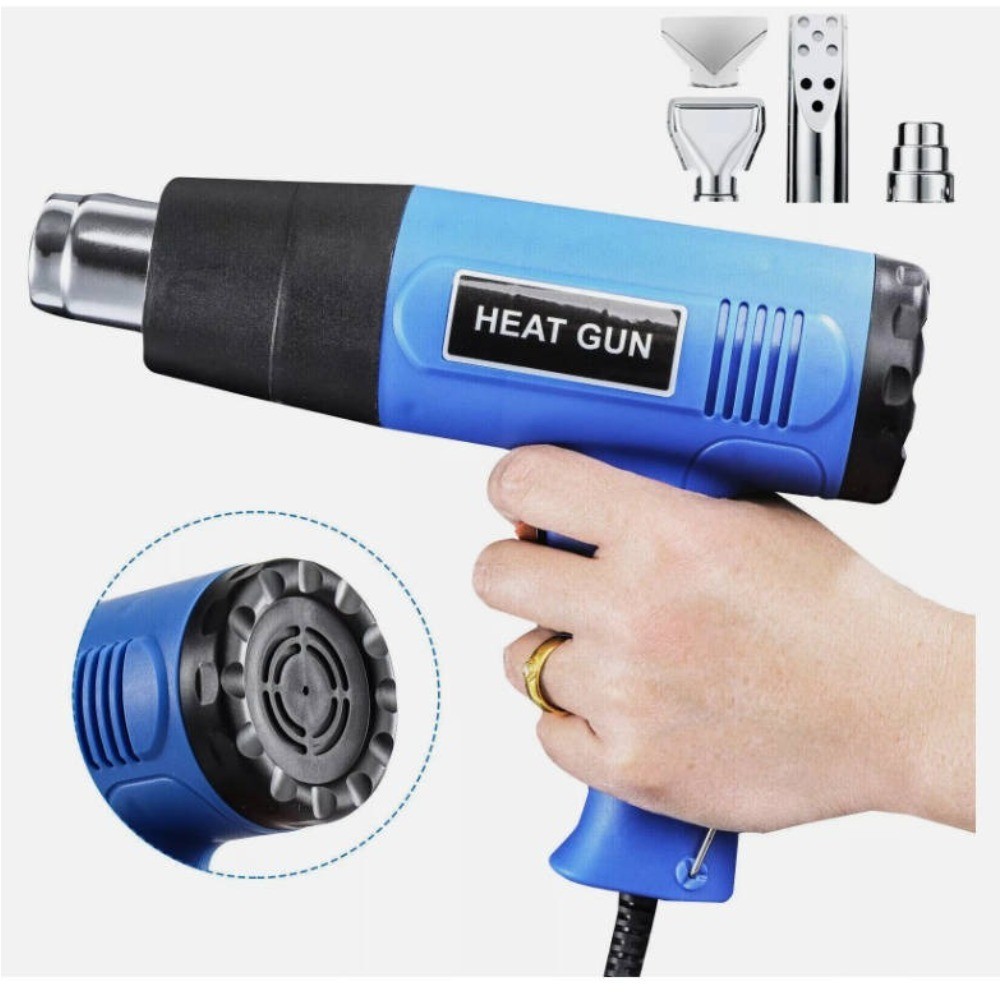 **Produktname:** Hochleistungs-Heißluftpistole **Produktmerkmale:**– Der leistungsstarke 2000-Watt-Motor bietet ausreichend Kontrolle und Leistung für die meisten Aufgaben und ist robust genug für anspruchsvolle Profis.– Abnehmbarer Frontring für Arbeiten in engen Ecken und schwer zugänglichen Stellen.– Hochwertige Heizelemente sorgen für zuverlässigen und sicheren Betrieb.– Integrierter Aufhängering für einfache Wandmontage.- Geeignet zum Rohrschweißen, PVC-Schweißen, Trocknen, Schrumpfen, Entlacken usw. **Produktspezifikationen:**- Hervorragendes Trocknungsmittel- Zum Trocknen von Kleidung- Zum Trocknen von Farbe oder Kitt- Taut gefrorene Rohre auf- Entfernt selbstklebende Aufkleber oder Vinyl von Autos und vieles mehr- Leistung: 2000 Watt- 2 Heizstufen / maximale Lufttemperatur 600 °C- Stufe 1: 300 °C- Stufe 2: 600 °C **Anwendungsszenarien:**- Rohrschweißen- PVC-Schweißen- Trocknen- Schrumpfen- Entlacken- Kunststoffschneiden- Rohrverlegung- Kunststoffschweißen- Tägliche Gartenarbeiten- Kabelschrumpfen- Folienschweißen- Nassschleifen- Überlappschweißen **Lieferumfang:**- Heißluftpistole * 1- Glasschutzdüse * 1- Leichtkohledüse * 1- Breitstrahldüse * 1- 1 x Reduzierdüse **Lieferumfang:**- 1 x Heißluftpistole- 4 verschiedene Düsen **Hinweis:**- Um eine Überhitzung zu vermeiden, wird empfohlen, das Produkt nach 15 Minuten Dauerbetrieb abzubrechen und abkühlen zu lassen, bevor Sie fortfahren. • •