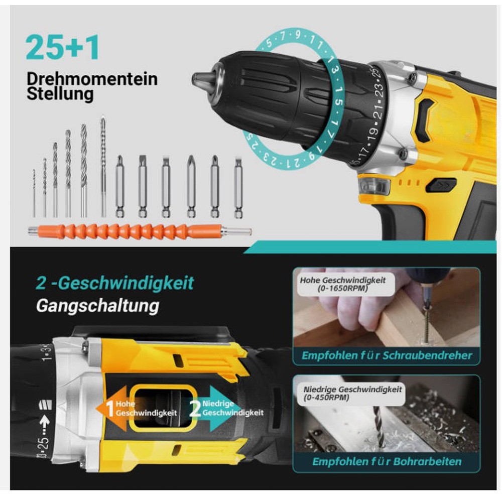 21 V Akkubetriebener Schlagbohrschrauber-Set   Produktspezifikationen:   – Nennleistung: 103 W – Maximales Drehmoment: 120 Nm – Minimales Drehmoment: 35 Nm   Produkteigenschaften:   – Akku-Kapazität: 2,5 Ah – Akku-Technologie: Lithium-Ionen (Li-ion) – Anzahl der Akkus: 2 – Akkus im Lieferumfang enthalten: Ja – Betriebsmodus: Akkubetrieben – Spannfutterschlussbereich: 10 mm (3/8 Zoll) – Spannfutter-Typ: Schlüsseloses Spannfutter – Geschwindigkeit: 1650 U/min – Farbe: Gelb – Gewicht: 1,6 kg – Maximales Drehmoment (zusätzliche Angabe): 40 Nm – Produkttyp: Akkubetriebener Schraubendreher – Spannung: 21 V   Produktbeschreibung:   Dieser Schlagschrauber verfügt über ein zweigeschwindigkeitsgetriebe aus Vollmetall, das eine hohe Leistungsübertragung und starkes Drehmoment bietet. Die Akkus zeichnen sich durch eine beeindruckend lange Laufzeit aus. Das 13-mm-Schlüsseloses Spannfutter besteht aus massivem Metall mit zentralen Spannbacken, und die automatische Spindelsperre ermöglicht eine schnellere Bedienung. Die bürstenlose Motorentechnologie und das 15-stufige Drehmomentmodul sorgen für präzises Anziehen in jeder Anwendungssituation.   Lieferumfang:   – 1 × Akkubetriebener Schlagbohrschrauber – 2 × Akkus – 6 × Schraubendreherbits (3 × Schlitzbits, 3 × Phillipsbits) – 6 × Spiralbohrer (1 × 3-mm-Silber-Spiralbohrer, 1 × 4-mm-Silber-Spiralbohrer, 1 × 5-mm-Silber-Spiralbohrer, 1 × 3-mm-Schwarz-Silber-Spiralbohrer, 1 × 4-mm-Schwarz-Spiralbohrer, 1 × 5-mm-Schwarz-Spiralbohrer) – 1 × Steckschlüsseladapter – 9 × Steckschlüssel (1 × 4 mm, 1 × 4,5 mm, 1 × 5 mm, 1 × 6 mm, 1 × 7 mm, 1 × 8 mm, 1 × 9 mm, 1 × 10 mm, 1 × 12 mm) – 1 × Schraubendreherbit-Adapter – 1 × Winkeladapter • •