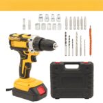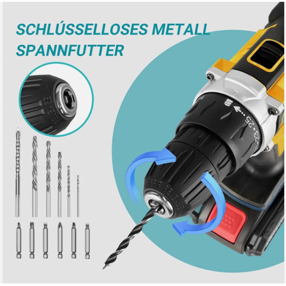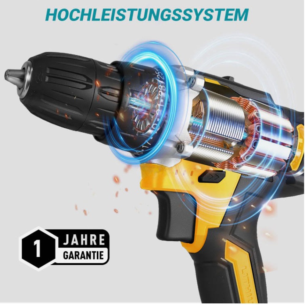 • 21 V Akkubetriebener Schlagbohrschrauber-Set   Produktspezifikationen:   – Nennleistung: 103 W – Maximales Drehmoment: 120 Nm – Minimales Drehmoment: 35 Nm   Produkteigenschaften:   – Akku-Kapazität: 2,5 Ah – Akku-Technologie: Lithium-Ionen (Li-ion) – Anzahl der Akkus: 2 – Akkus im Lieferumfang enthalten: Ja – Betriebsmodus: Akkubetrieben – Spannfutterschlussbereich: 10 mm (3/8 Zoll) – Spannfutter-Typ: Schlüsseloses Spannfutter – Geschwindigkeit: 1650 U/min – Farbe: Gelb – Gewicht: 1,6 kg – Maximales Drehmoment (zusätzliche Angabe): 40 Nm – Produkttyp: Akkubetriebener Schraubendreher – Spannung: 21 V   Produktbeschreibung:   Dieser Schlagschrauber verfügt über ein zweigeschwindigkeitsgetriebe aus Vollmetall, das eine hohe Leistungsübertragung und starkes Drehmoment bietet. Die Akkus zeichnen sich durch eine beeindruckend lange Laufzeit aus. Das 13-mm-Schlüsseloses Spannfutter besteht aus massivem Metall mit zentralen Spannbacken, und die automatische Spindelsperre ermöglicht eine schnellere Bedienung. Die bürstenlose Motorentechnologie und das 15-stufige Drehmomentmodul sorgen für präzises Anziehen in jeder Anwendungssituation.   Lieferumfang:   – 1 × Akkubetriebener Schlagbohrschrauber – 2 × Akkus – 6 × Schraubendreherbits (3 × Schlitzbits, 3 × Phillipsbits) – 6 × Spiralbohrer (1 × 3-mm-Silber-Spiralbohrer, 1 × 4-mm-Silber-Spiralbohrer, 1 × 5-mm-Silber-Spiralbohrer, 1 × 3-mm-Schwarz-Silber-Spiralbohrer, 1 × 4-mm-Schwarz-Spiralbohrer, 1 × 5-mm-Schwarz-Spiralbohrer) – 1 × Steckschlüsseladapter – 9 × Steckschlüssel (1 × 4 mm, 1 × 4,5 mm, 1 × 5 mm, 1 × 6 mm, 1 × 7 mm, 1 × 8 mm, 1 × 9 mm, 1 × 10 mm, 1 × 12 mm) – 1 × Schraubendreherbit-Adapter – 1 × Winkeladapter