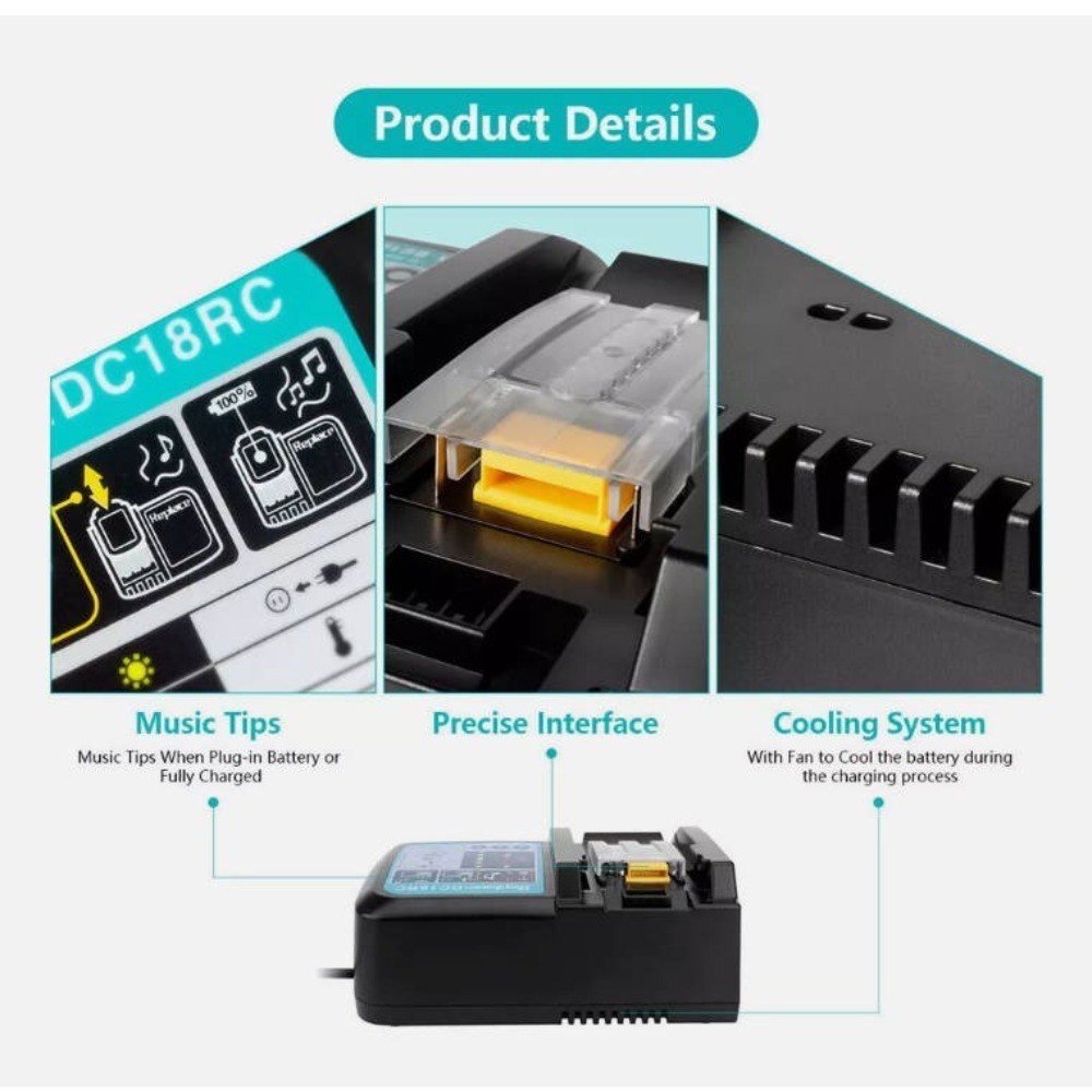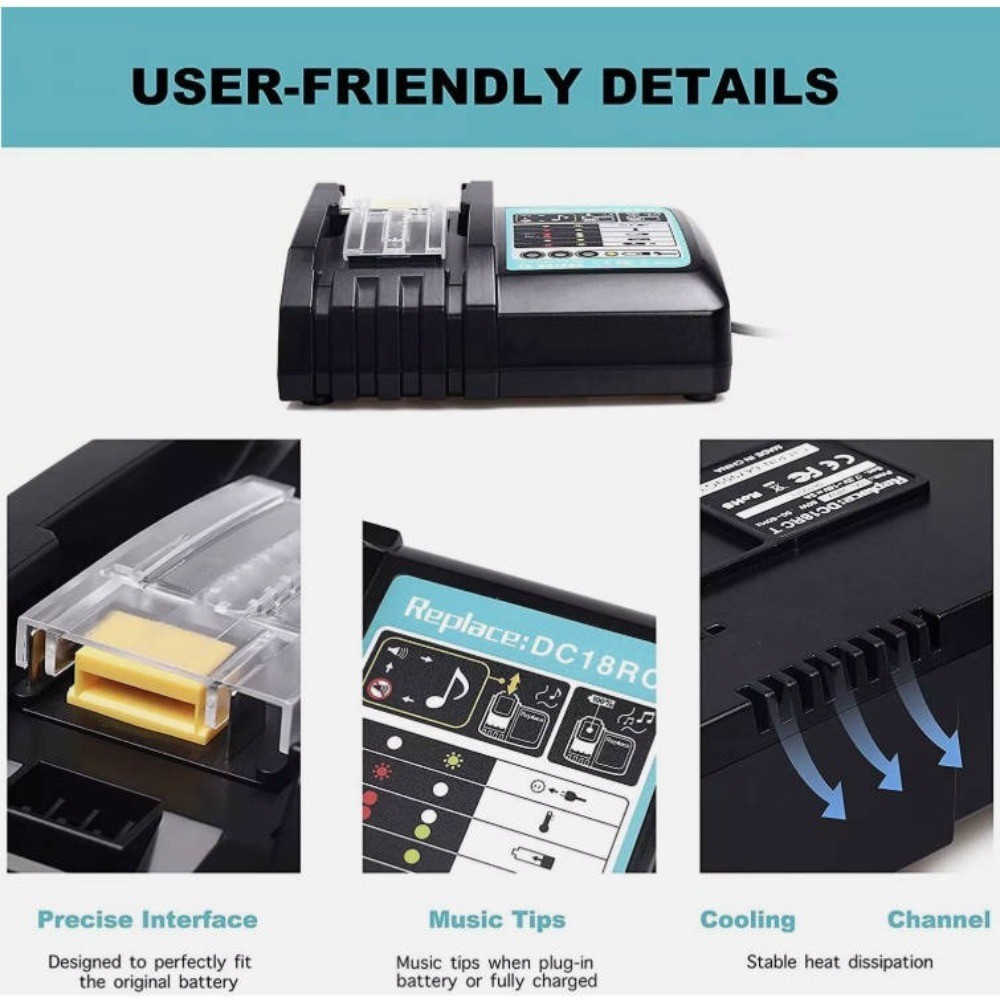 **Produktmerkmale**: – **Umfangreiche Kompatibilität**: Ladeeingang: AC 110-220 V • DC 14,4-18 V • Stromstärke: 3,0 A. – **Hohe Kompatibilität**: Geeignet zum Ersetzen verschiedener Makita 14,4-18 V Akkumodelle. – **Schnellladung**: EU-Standard-Ausgangsstecker (110-220 V) für schnelles Laden in 30 Minuten. – **Sicherheit im Gebrauch**: Intelligentes Lademanagement, multifunktionale LED-Anzeige, mehrere Schutzfunktionen, Überlastschutz. **Technische Daten**: – **Eingangsspannung**: AC 100-240 V, 50-60 Hz – **Ausgangsspannung**: DC 14,4-18 V – **Ladestrom**: 3,0 A – **Ladeeffizienz**: ≥ 80 % – **Betriebsumgebung**: Temperatur 0-40 °C, Luftfeuchtigkeit ≤ 85 %, Luftdruck 86-106 kPa – **Lager- und Versandumgebung**: Temperatur -20-65 °C, Luftfeuchtigkeit ≤ 90 %, Luftdruck 70-106 kPa **Produktname**: 18650 Akkuladegerät **Produktmerkmale**:- **Umfangreiche Kompatibilität**: Ladeeingang: AC 110–220 V