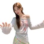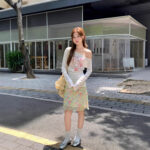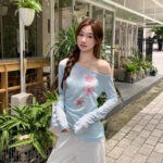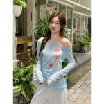 Sweet Floral Print Off-Shoulder Sheer Blouse Long-Sleeve T-Shirt Womens Sun-Protective Off-Shoulder Top