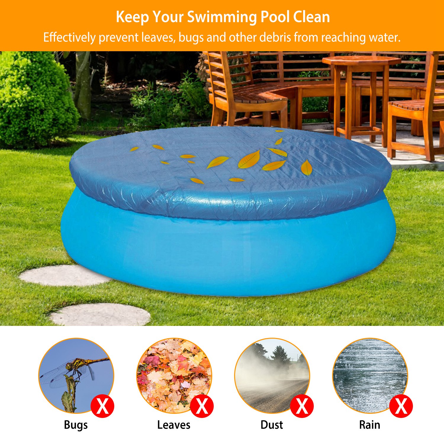 • *Block Debris*:This cover can effectively prevent leaves,bugs and other debris from reaching water. Therefore,you can spend less time on vacuuming the pool.