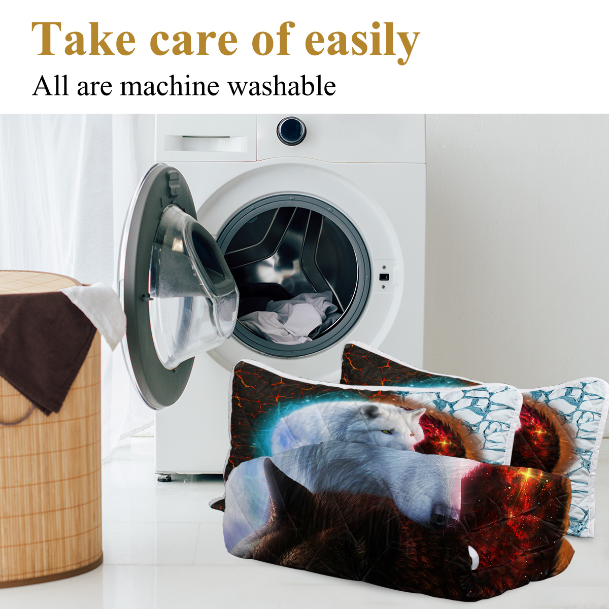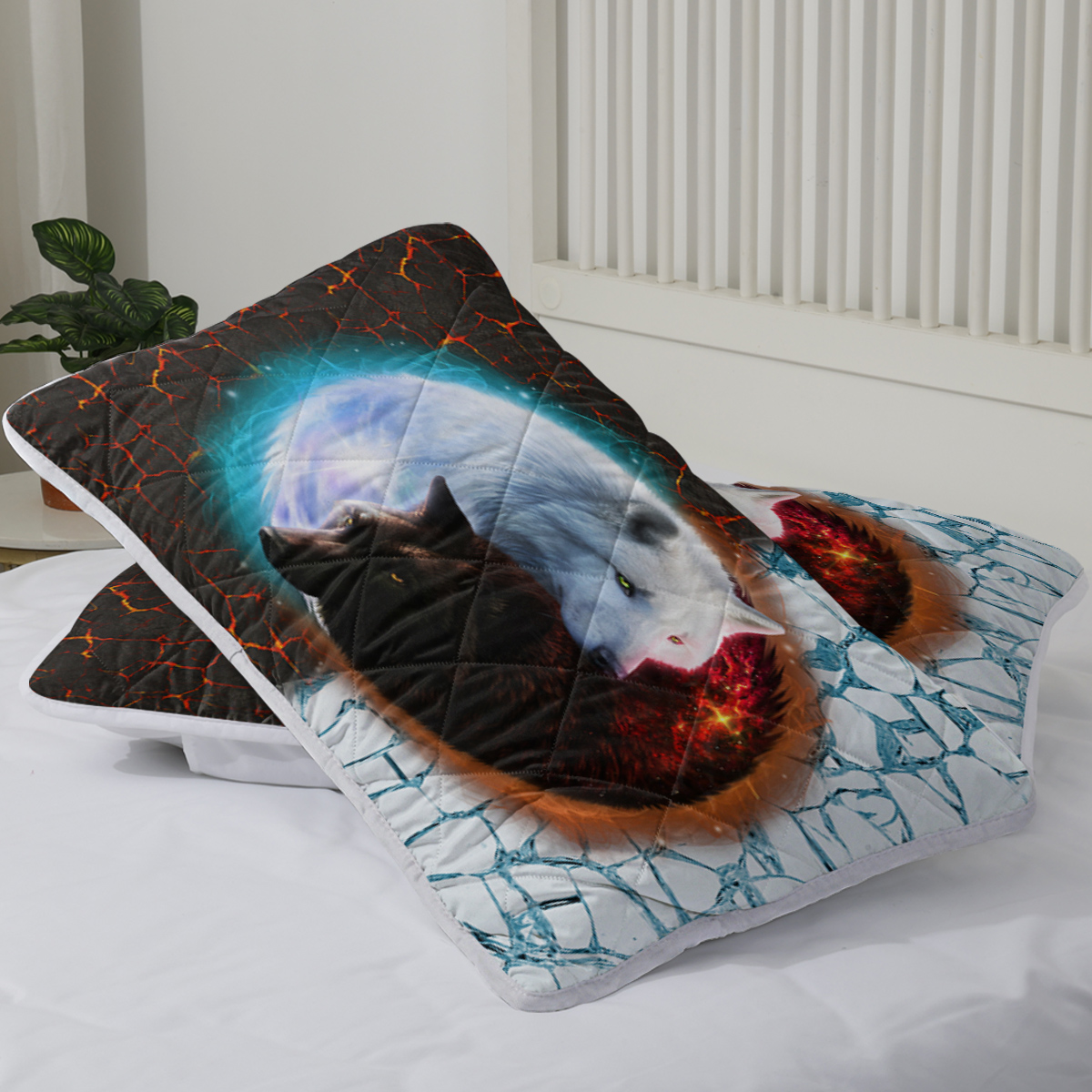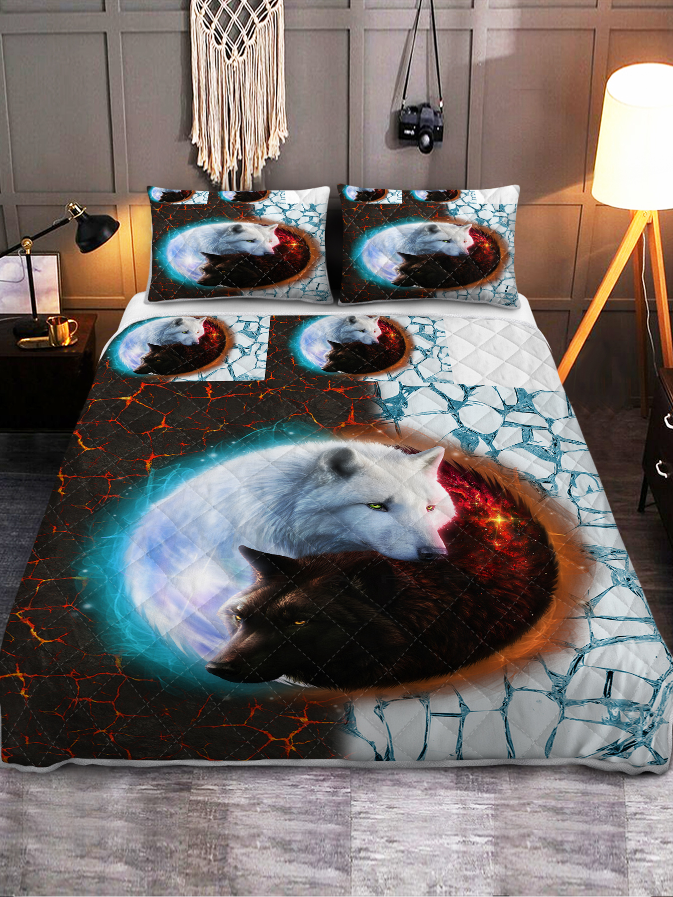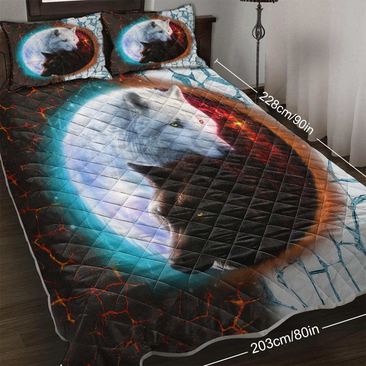 Tai Chi Wolf Quilt Set, Safari Animals Black White Quilt Bedding Set With 2 Pillowcases, Traditional Chinese Paint Graffiti Red Blue Bedding Set is designed for style, comfort, and everyday use.