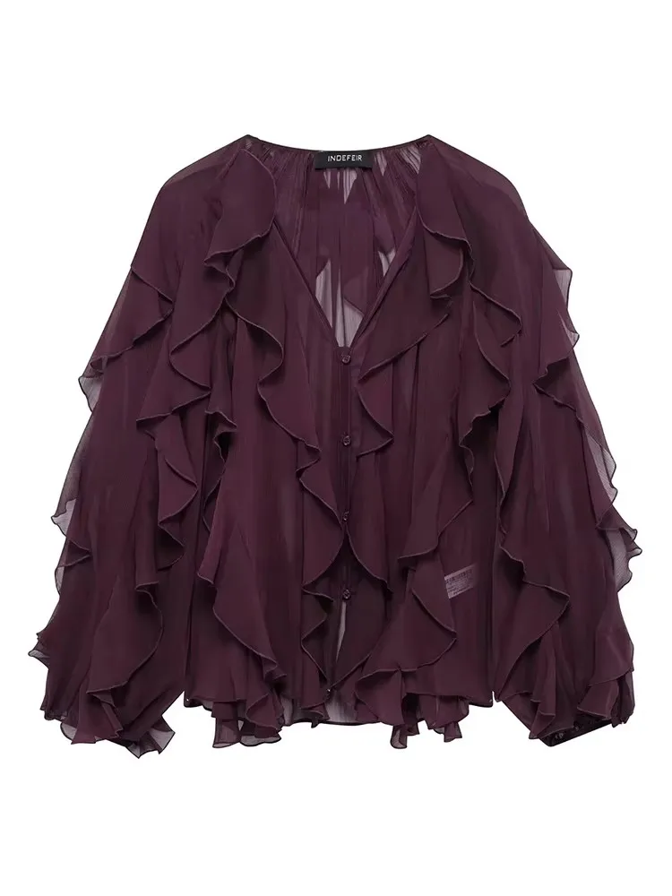 Step into 2025 with this stunning and trendy women’s blouse from TFMLN. Crafted to combine style and comfort, this translucent ruffle blouse brings a chic vibe to any wardrobe. Whether you’re heading to the beach, a casual day out, or enjoying a laid-back evening, this V-neck single-breasted top has you covered.