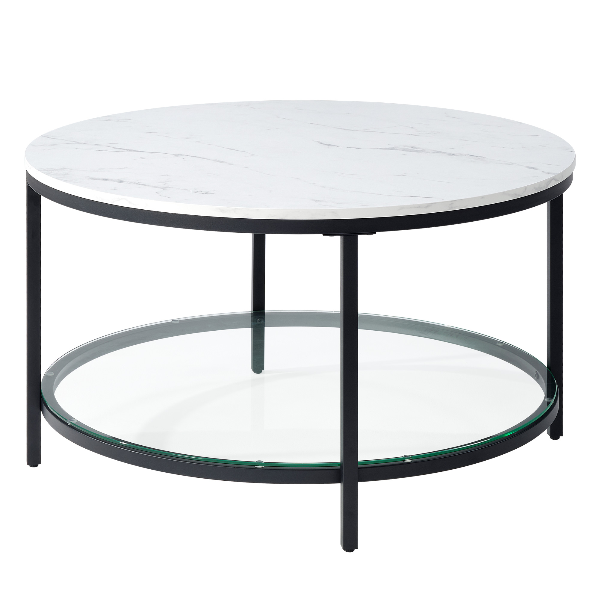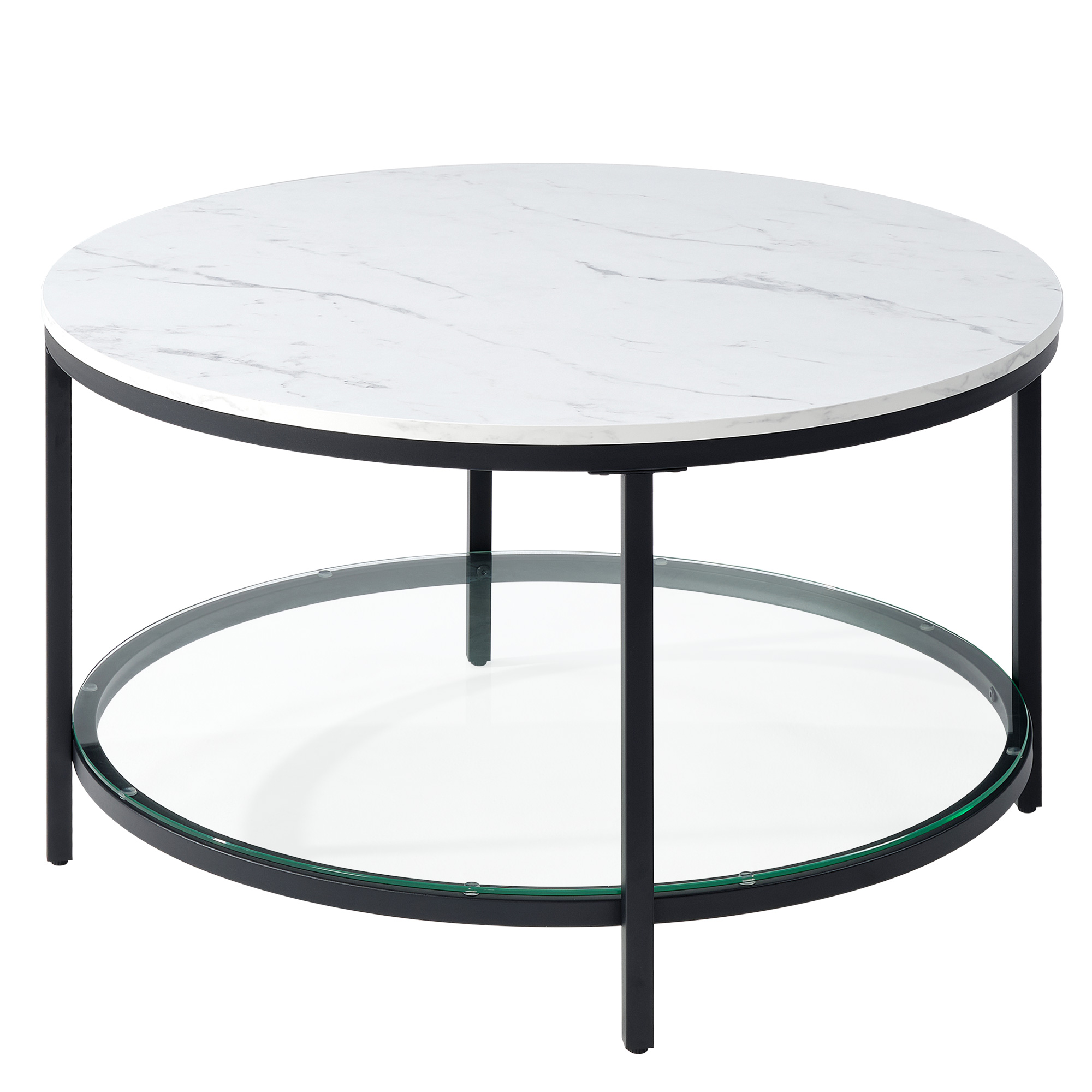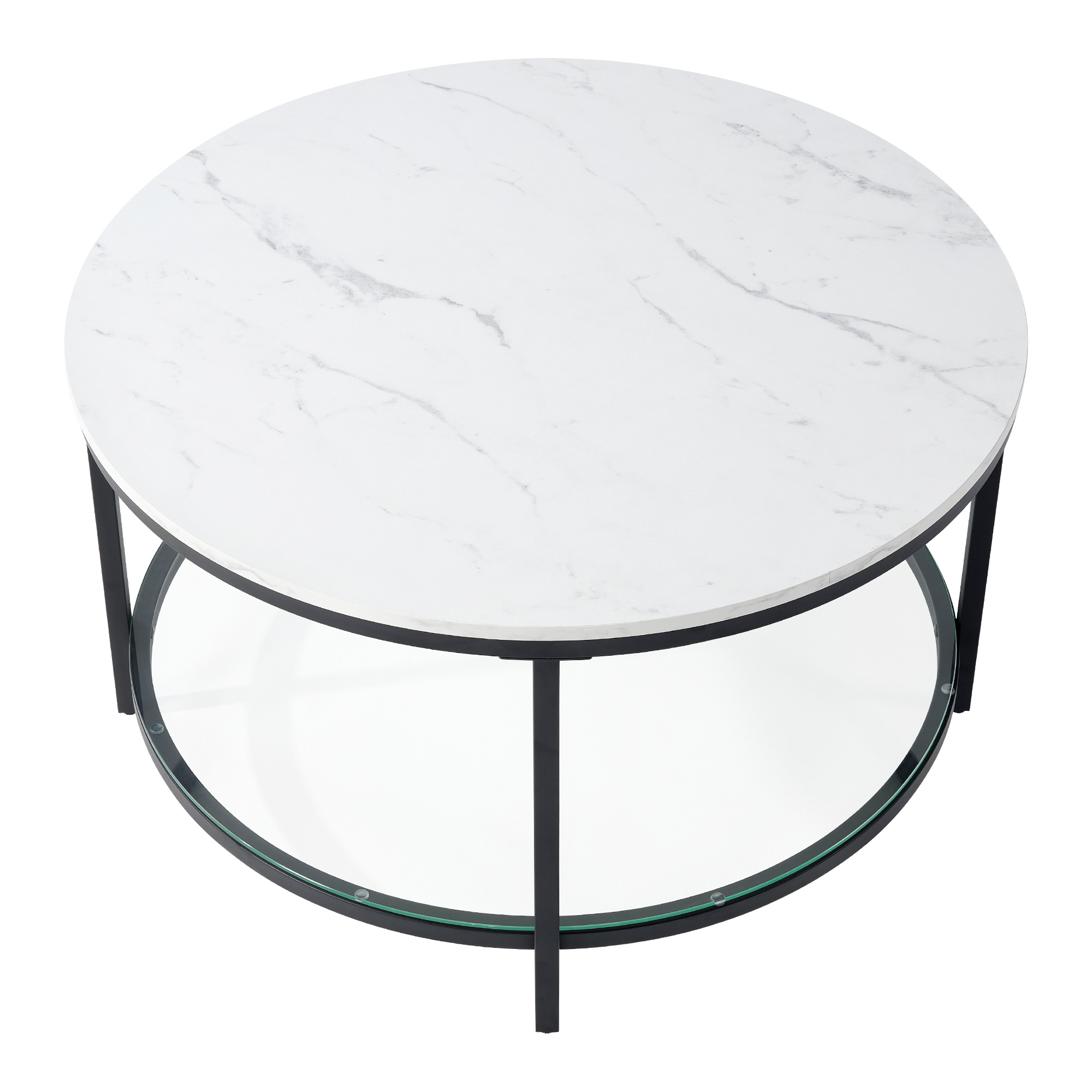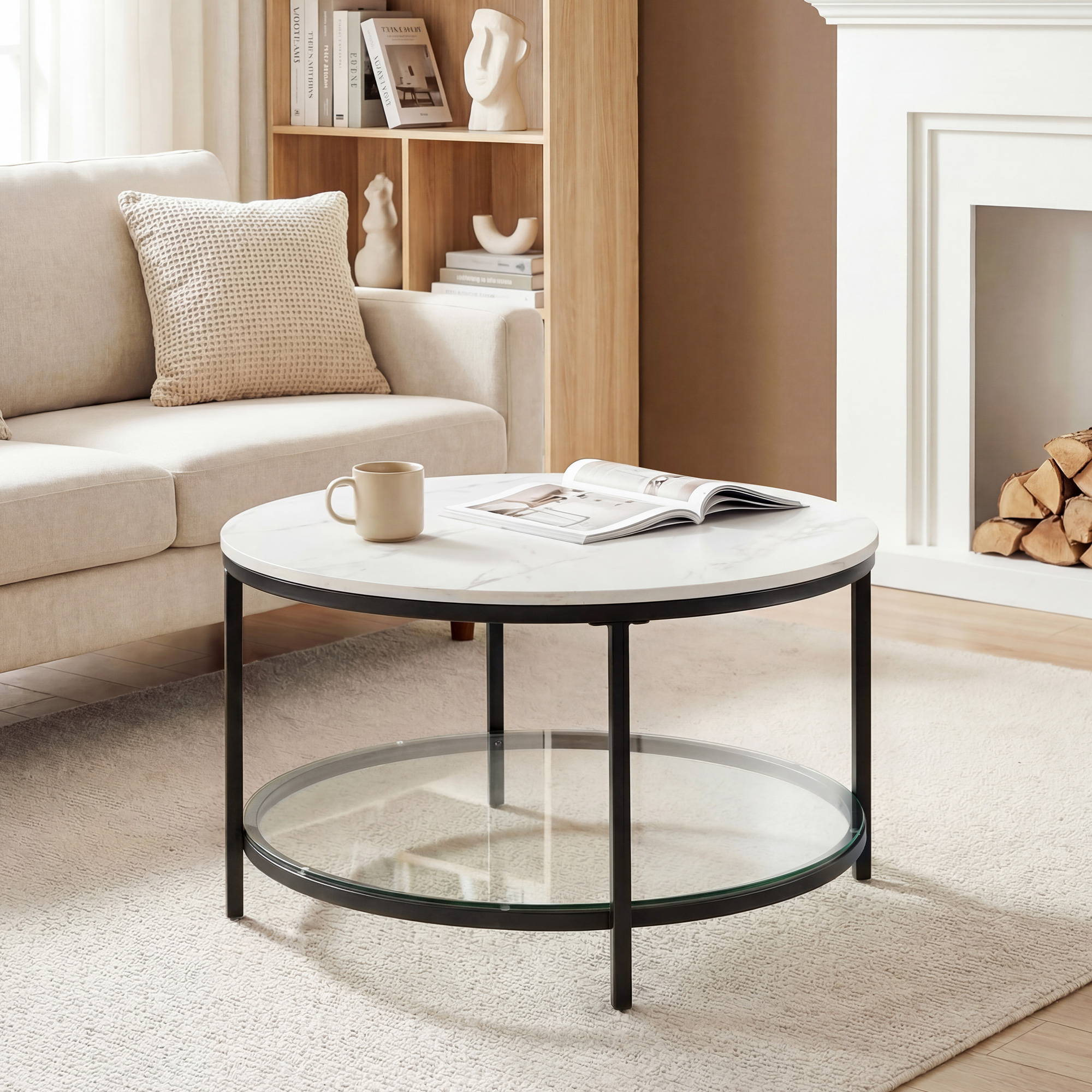 The Living Room Features A Marble Circular Glass Coffee Table, And A Double-layer Circular Transparent Coffee Table With Storage Function.