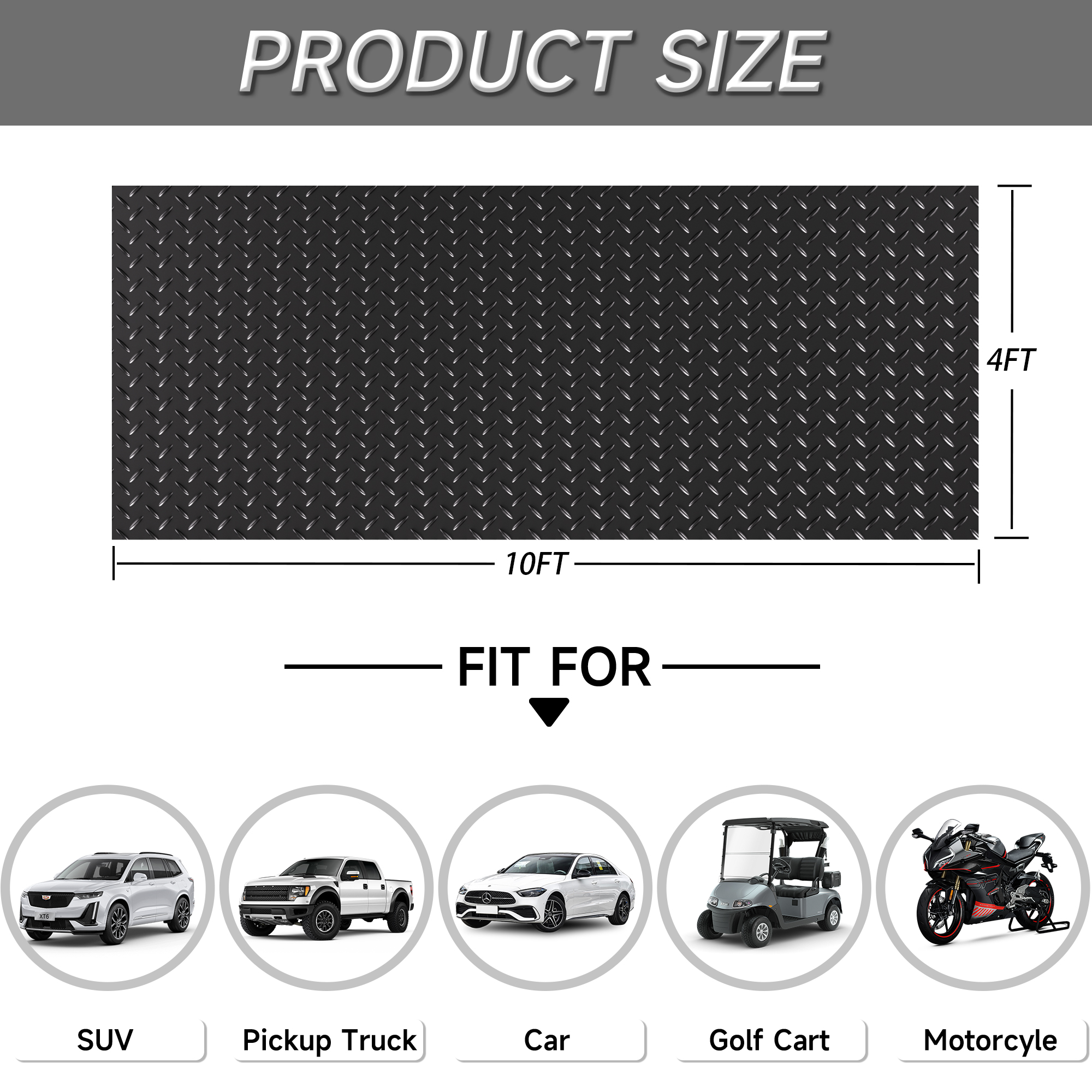 Basic informationProduct Type:Single Box ProductProduct Name:Thickened Diamond 4 ft. x 10 ft. Black PVC Garage Flooring Rolls(40 sq. ft.)Color:BlackMaterial:PVCProduct sizeAssembly Length (inches):120.00Assembly Width (inches):48.00Assembly Height (inches):0.08Product Weight (lbs):30.00Package sizeLength (inches):50.00Width (inches):4.00Height (inches):4.00Weight (lbs):33.00Product features:Heavy-Duty Thickened PVC: Built to endure extreme weight (trailers, trucks) without warping, offering unmatched wear resistance and long-term durability for demanding environments.Anti-Slip Diamond Texture: Maximizes grip with a textured surface while repelling mud, oil, and chemicals; stain-resistant and waterproof for quick dry-mop or hose cleaning.Instant Customization & Setup: Roll out smoothly and trim to fit any space effortlessly with scissors or a utility knife-no tools required for quick installation.Large-Scale Vehicle Protection: Designed for SUVs, RVs, and sports cars, providing ample coverage to safeguard floors under oversized vehicles and cargo.Versatile Commercial/Home Use: Perfect for garages, parking lots, hospitals, and food factories-low-maintenance, economical floor defense for high-traffic areas.Weather/UV-Resistant: Withstands harsh conditions, including UV exposure and temperature swings, ensuring fade-free performance year-round.