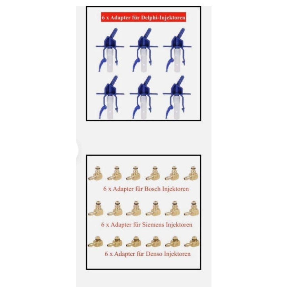 - Fuel Injector Return Flow Tester 24 Adapters 6-Cylinder Simultaneous Test Bosch Siemens Delphi Denso Universal KitPRODUCT DESCRIPTIONProfessional Fuel Injector Return Flow Tester Kit for comprehensive diagnostic testing of up to 6 injectors simultaneously. This complete 25-piece set includes 24 specialized adapters (6 each for Delphi, Bosch, Siemens, and Denso injectors) plus graduated cylinders, measuring tubes, and a storage bottle with hose. All components housed in a custom plastic case with retention slots. Perfect for professional workshops and diesel engine specialists.KEY FEATURES:✔ 6-CYLINDER SIMULTANEOUS TESTING: Test up to 6 injectors at once for maximum efficiency and batch diagnostics✔ 24 BRAND-SPECIFIC ADAPTERS: Includes 6 Delphi, 6 Bosch, 6 Siemens, and 6 Denso adapters for comprehensive vehicle coverage✔ HIGH-PRECISION MEASUREMENT: 6 graduated glass cylinders and 6 graduated tubes provide accurate return flow volume measurement✔ PROFESSIONAL-GRADE QUALITY: All components made from premium aging-resistant materials for long-term durability✔ PORTABLE ORGANIZED CASE: Custom plastic tool case with retention slots keeps all components secure and organized✔ 70CM CONNECTION HOSE: Optimal length for flexible connection to all cylinders✔ INTEGRATED RESERVOIR BOTTLE: Includes bottle with hose for collecting and observing return fuelcesSPECIFICATIONS:Manufacturer Part Number: qunnie-226fbaProduct Type: Fuel Injector Return Flow TesterThread Type: JIC StandardMeasurement Accuracy: ±1%Product Weight: 1.39 kg / 3.06 lbsPackage Dimensions: 7.5cm × 27.1cm × 37.6cm (2.95″ × 10.67″ × 14.8″) Material: Aging-Resistant Plastic + Metal AdaptersCompatible Brands: Bosch-01, Siemens-02, Denso-03, DelphiTesting Capacity: 6 Injectors SimultaneouslyCountry of Origin: ChinaEAN Code: 4067957964614 Condition: Brand New, UnusedCOMPLETE KIT CONTENTS:**Injector Adapters (24 Total):** – 6 × Delphi Injector Adapters – 6 × Bosch Injector Adapters – 6 × Siemens Injector Adapters – 6 × Denso Injector Adapters**Measurement significant differences indicate injector problems – Normal condition shows consistent return flow across all cylindersSAFETY WARNINGS:⚠️ **ADAPTER **: Confirm injector brand and select correct adapter model before testing⚠️ **SECURE CONNECTION**: Ensure O-rings are intact when connecting adapters to prevent fuel leaks⚠️ **VENTILATION**: Operate in well-ventilated area away from ignition sources and high temperatures⚠️ **FUEL HANDLING**: Test fuel can be reused but must be filtered before returning to system ⚠️ **HANDLE WITH CARE**: Glass cylinders are fragile; handle gently to avoid breakage ⚠️ **POST-USE CLEANING**: Clean all components promptly after use to prevent fuel gumming and cloggingsePACKAGE & SHIPPING: – Complete 25-piece set packed in custom plastic case with retention slots