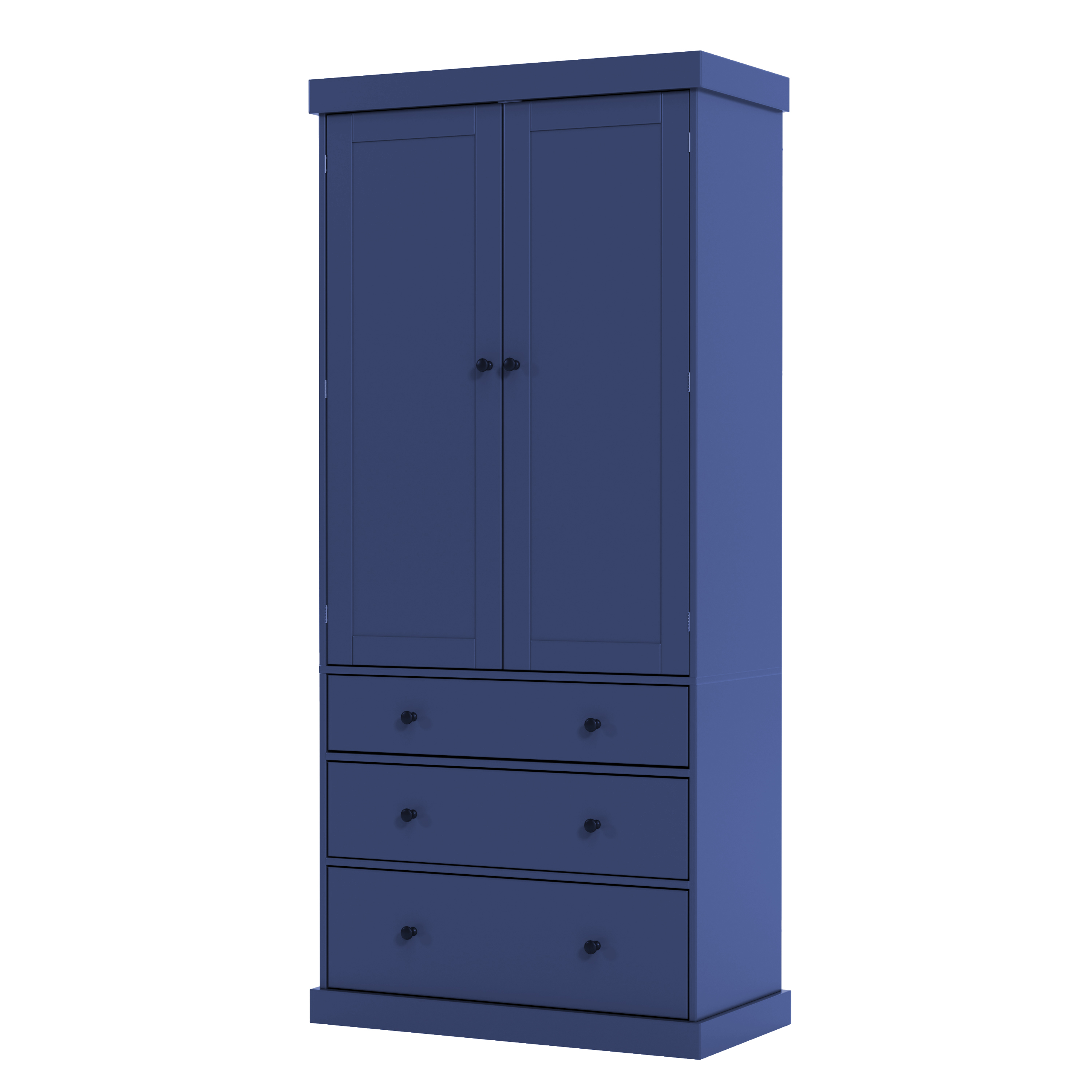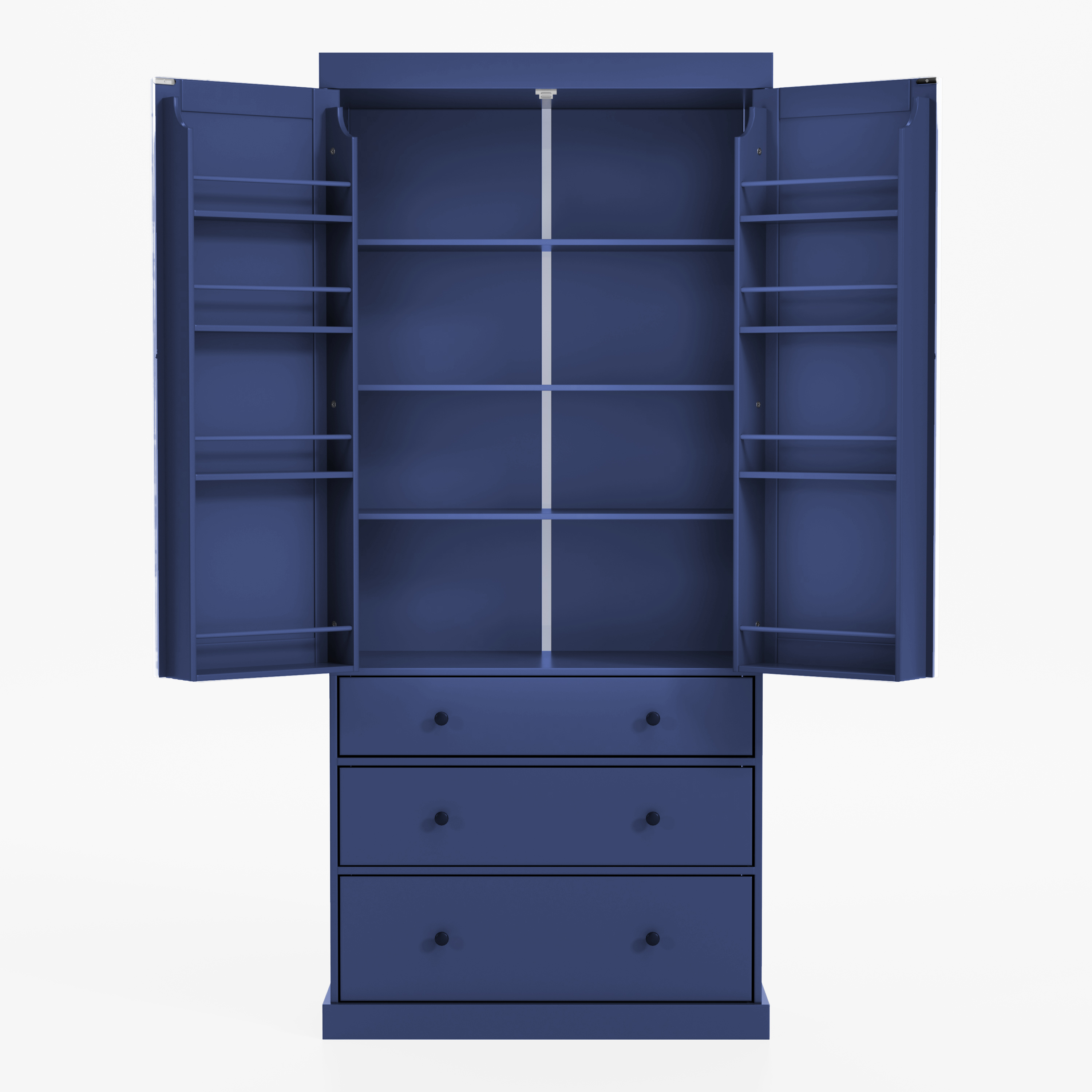 - N717S000047CProduct Type :Combo ItemProduct Name:TOPMAX 77″ Farmhouse Kitchen Pantry, Freestanding Tall Cupboard Storage Cabinet with 3 Adjustable Shelves, 8 Door Shelves, 3 Drawers for Kitchen, Dining Room, Blue (SP000047)Place of Origin:ChinaMain Color:BlueMain Material:MDFProduct Style:FarmhouseUse Case:KitchenStorage Features:Adjustabel ShelvesProduct DimensionsAssembled Length (in.):35.00Assembled Width (in.):17.70Assembled Height (in.):77.00Product Weight (lbs.):148.00Package SizeSub-item 1: N717P385357CPackage Quantity: 139.25 * 22.05 * 7.8 in. 73.19 lbs.Sub-item 2: N717P385356CPackage Quantity: 149.61 * 21.65 * 8.07 in. 88.85 lbs.Product Features[Spacious Kitchen Pantry] This kitchen pantry, crafted from painted MDF, outshines other options on the market with its impressive height and width—standing tall at 77 inches and spanning 35 inches wide. With 3 adjustable shelves, 8 door shelves, and 3 convenient slide-out drawers, it’s designed to effortlessly meet your storage needs, making organization a breeze.[Adjustable Shelves] Featuring 3 adjustable shelves, each offering 3 height options, this storage cabinet effortlessly adapts to your storage needs. With its clever design dividing the cabinet into four tiers, you’ll effortlessly organize your belongings while optimizing space utilization. Say goodbye to clutter and hello to a seamlessly organized living space.[8 Door Shelves] Adding to its space-saving prowess, this kitchen pantry features a hidden gem behind its doors: total 8-tiered door shelves system. The shelves boast varying heights and includes guardrails to prevent items from toppling over. Now, you can make the most of every inch of storage space while keeping your essentials securely organized.[3 Large Drawers]Combining convenience with elegance, this kitchen pantry boasts 3 slide-out drawers, each adorned with 2 handles for effortless access. With unique different sizes and sleek design, these drawers not only enhance visual appeal but also offer ample storage space to fulfill your organizational requirements. Embrace a stylishly orderly kitchen with this sophisticated storage solution.[Dimensions and Warranty] Overall size:35×17.7x77inch(LXWXH). Each Shelf Weight Capacity:110lbs; Each Door Shelf: 33lbs and each drawer is 44lbs. For detailed size, please check the dimension image.For safety, 2 anti-tipping devices included. 2 boxes in total which may not come together. Assembly video provided for your convenience.Please feel free to contact us if any issues.