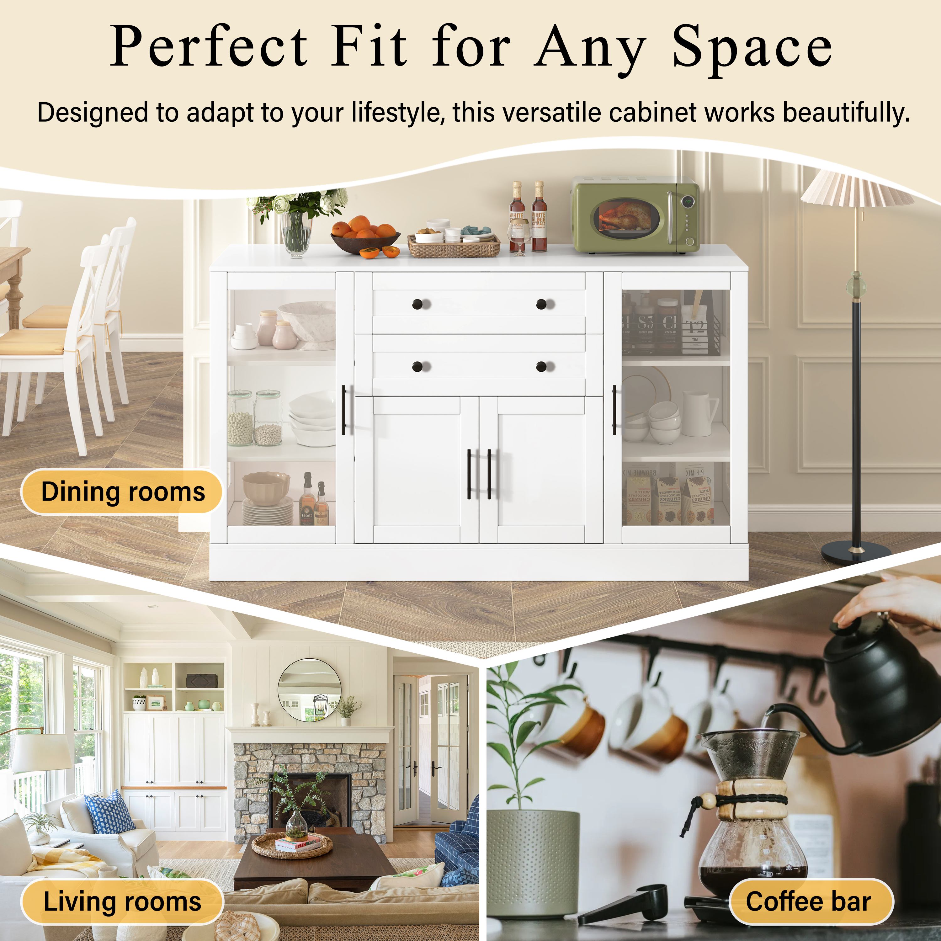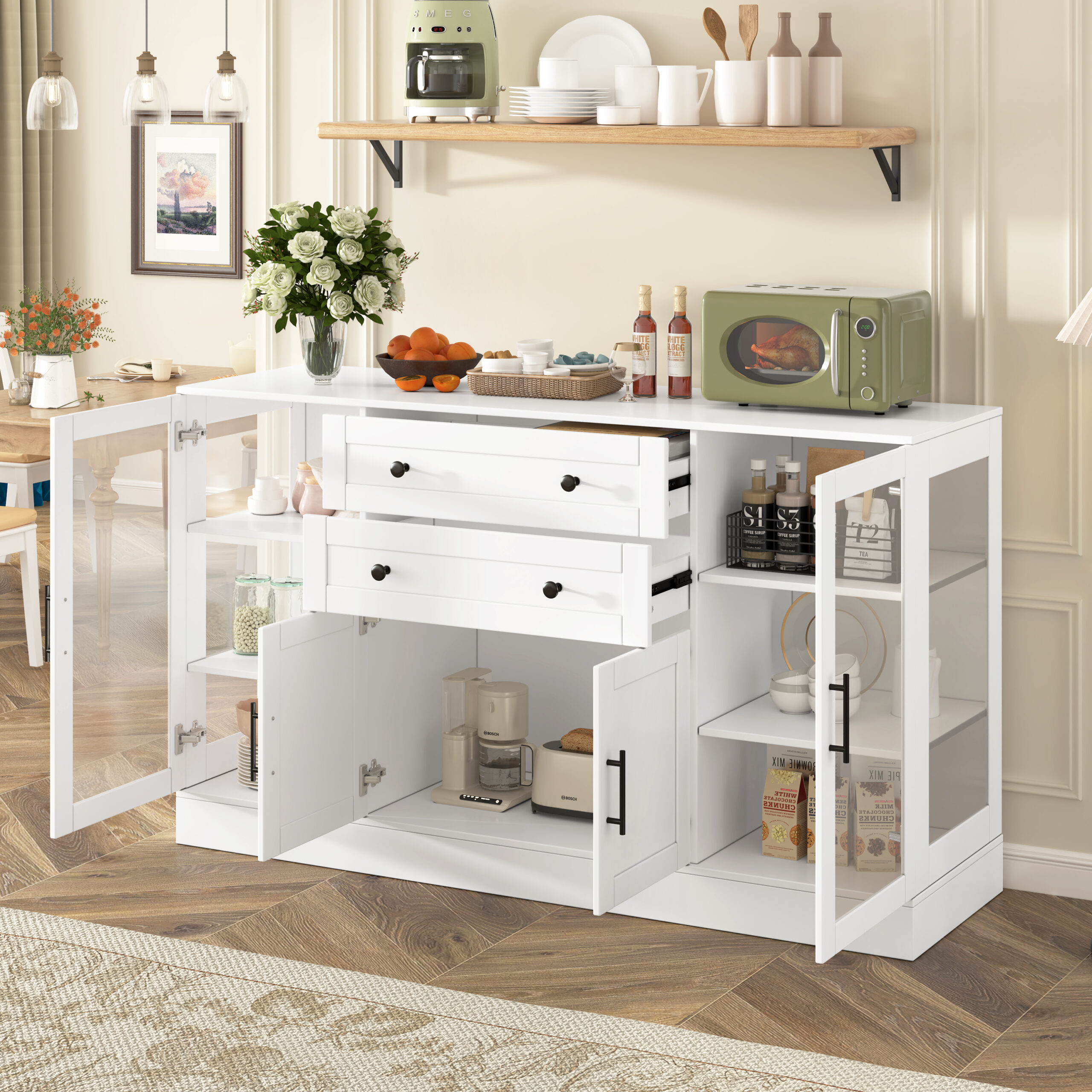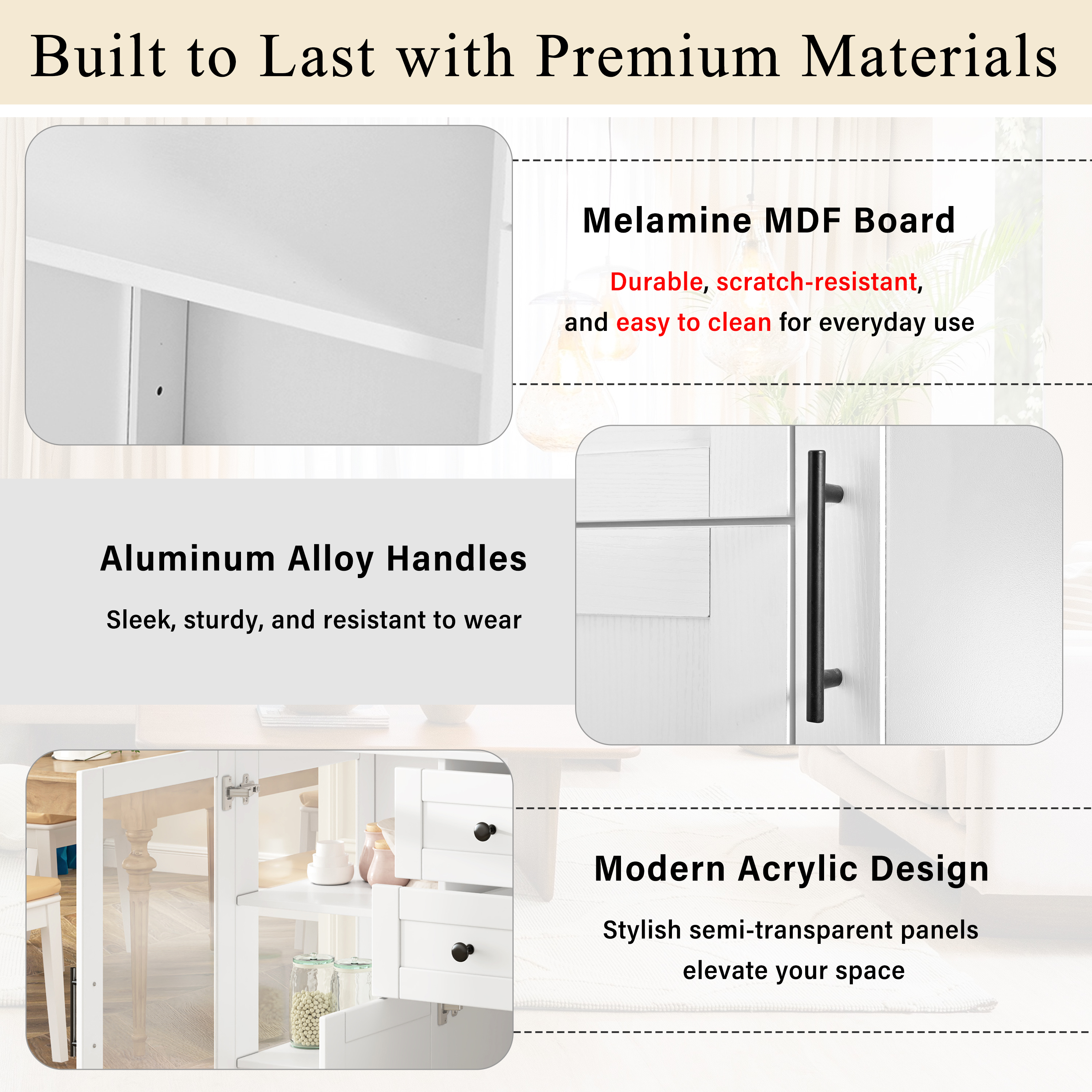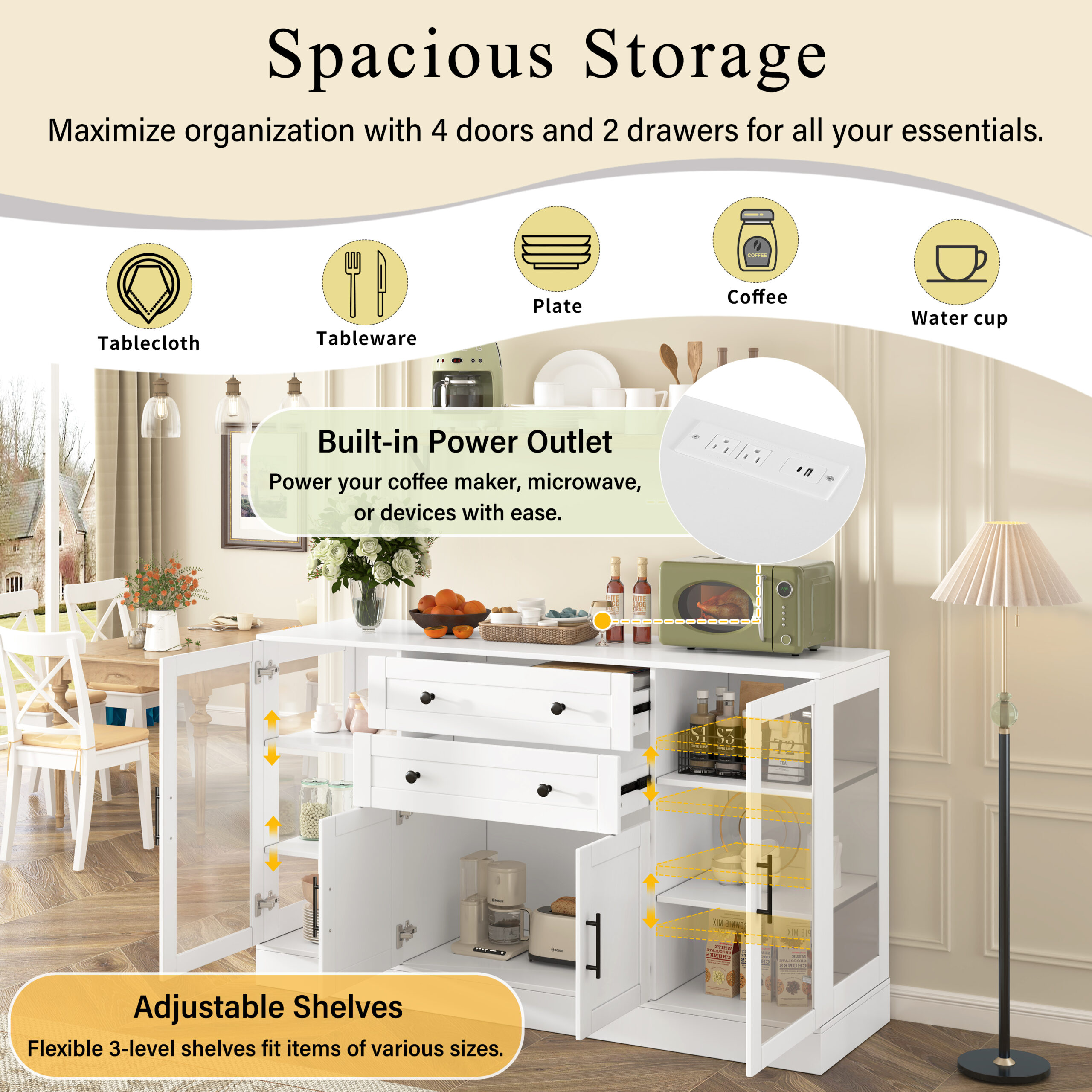 U- Style 58.3 Modern Buffet Sideboard With 4 Doors & 2 Drawers Adjustable Shelves Power Outlet Acrylic Panels Aluminum Alloy Handles Storage Cabinet For Dining Room Living Room And Kitchen is designed for style, comfort, and everyday use.