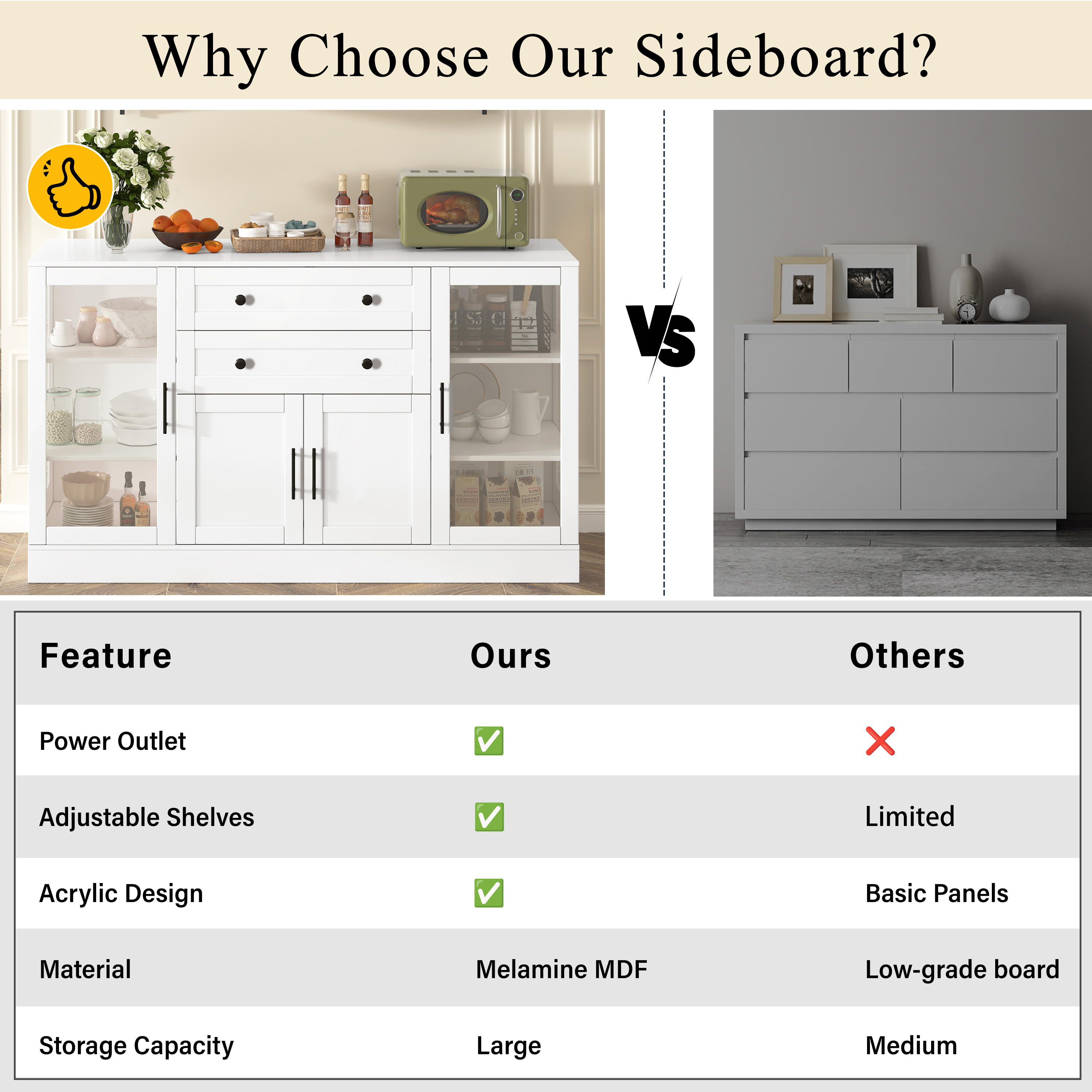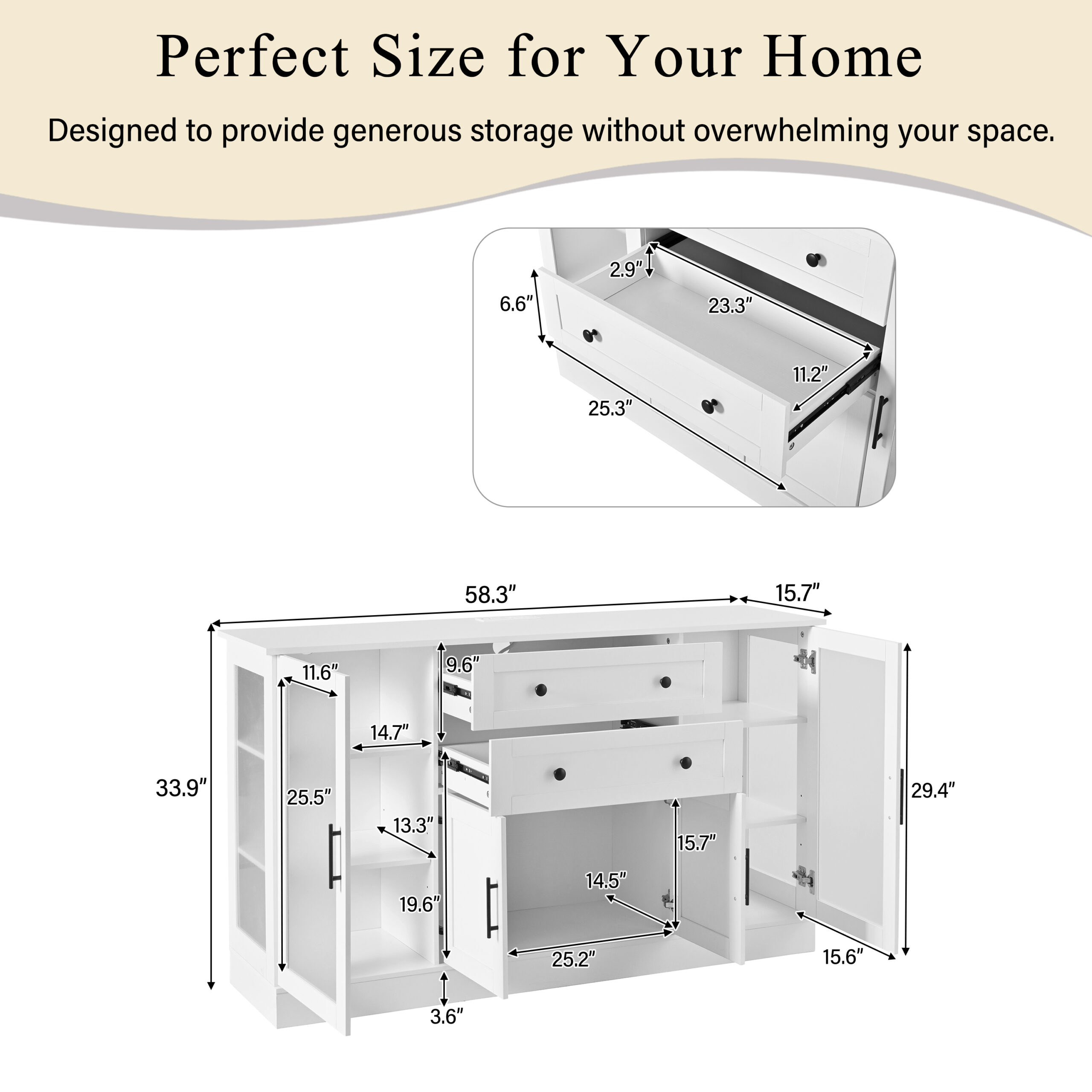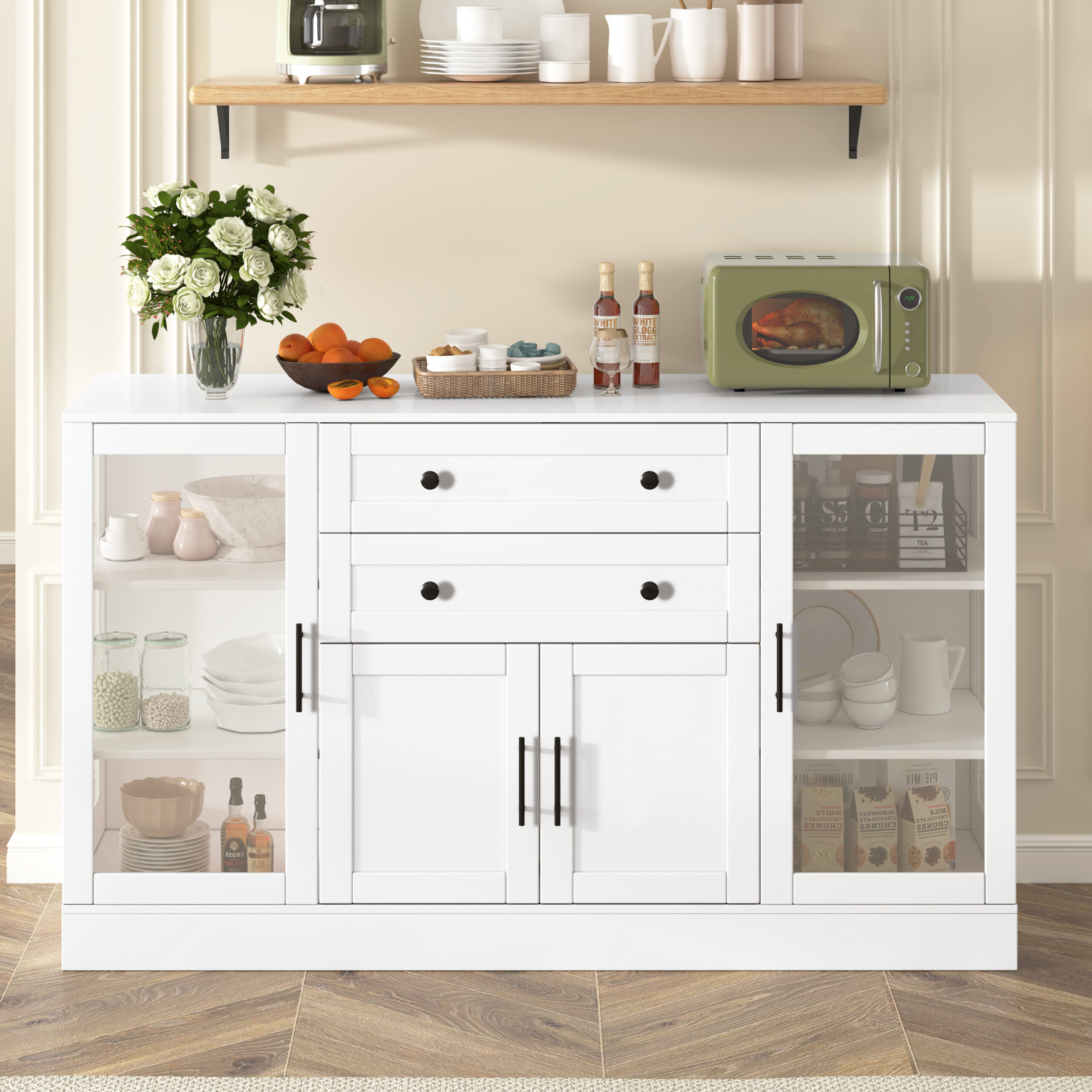 N711P437648KProduct Type :Single Box ProductProduct Name:U-Style 58.3″ Modern Buffet Sideboard with 4 Doors & 2 Drawers, Adjustable Shelves, Power Outlet, Acrylic Panels, Aluminum Alloy Handles, Storage Cabinet for Dining Room, Living Room and KitchenMain Color:WhiteMain Material:MDFProduct DimensionsAssembled Length (in.):58.30Assembled Width (in.):15.70Assembled Height (in.):33.90Product Weight (lbs.):80.14Package SizeLength (in.):63.55Width (in.):19.25Height (in.):7.05Weight (lbs.):87.20