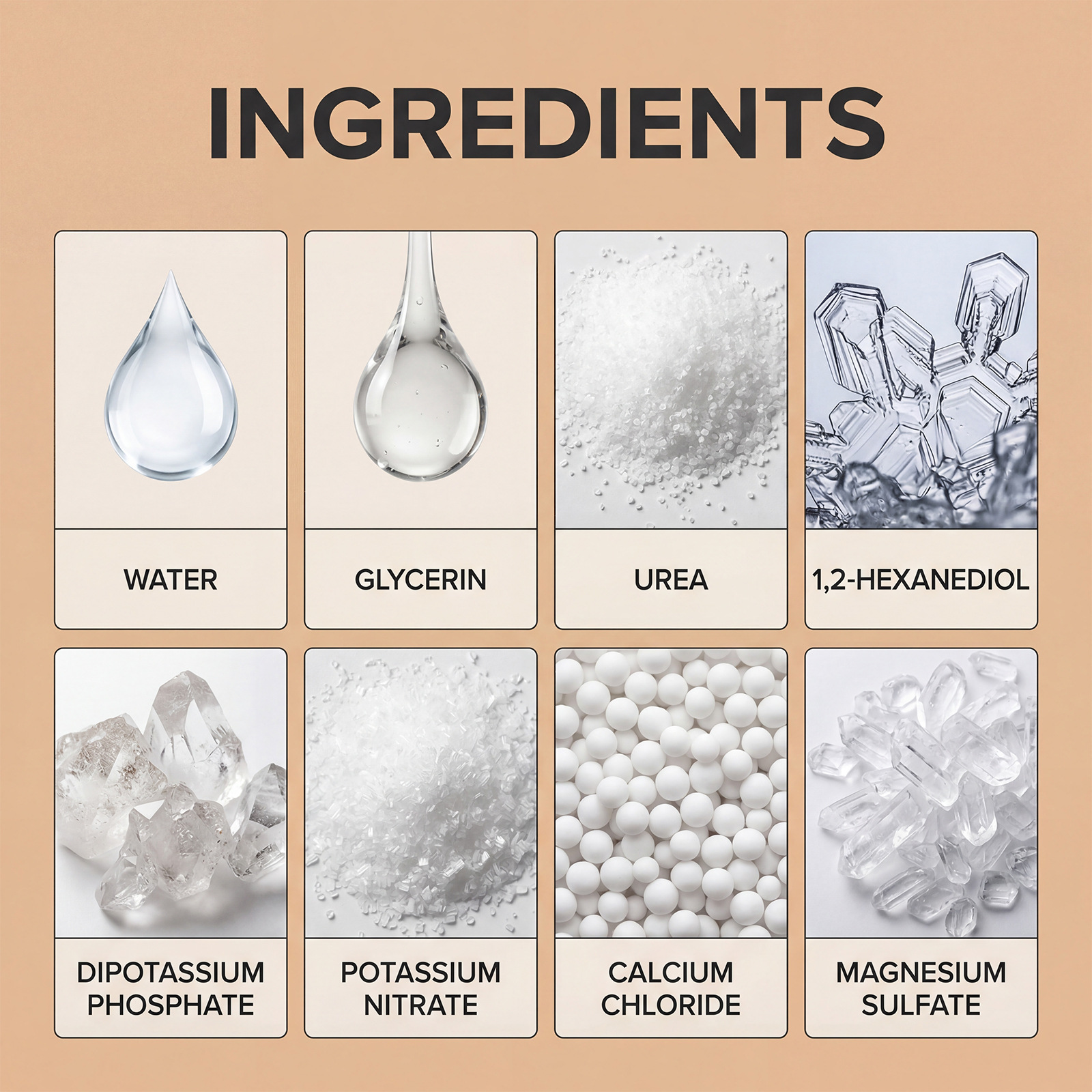 • Water, Glycerin, Urea, 1,2-Hexanediol, Dipotassium Phosphate, Potassium Nitrate, Calcium Chloride, Magnesium Sulfate