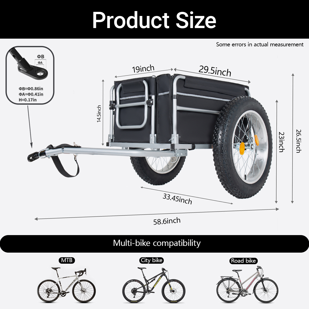 • W2932P417634Product Type :Single Box ProductProduct Name:Upgraded 23″x4.0 Fat Tires Bike Cargo Trailer, 150LBS Load Capacity Heavy-Duty Bicycle Wagon Cart, Foldable Compact Storage, Universal Safe Hitch System, for Camping, Groceries & Hauling EssentialsMain Color:BlackMain Material:SteelCustomize:Yes* The customized service is available with this product. You may contact the Seller for details.Product DimensionsAssembled Length (in.):58.60Assembled Width (in.):33.45Assembled Height (in.):26.50Product Weight (lbs.):38.30Package SizeLength (in.):24.02Width (in.):12.20Height (in.):34.65Weight (lbs.):42.70