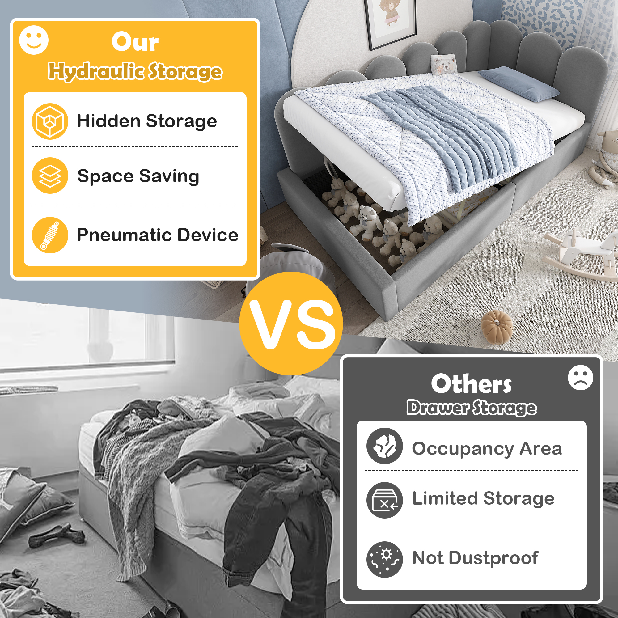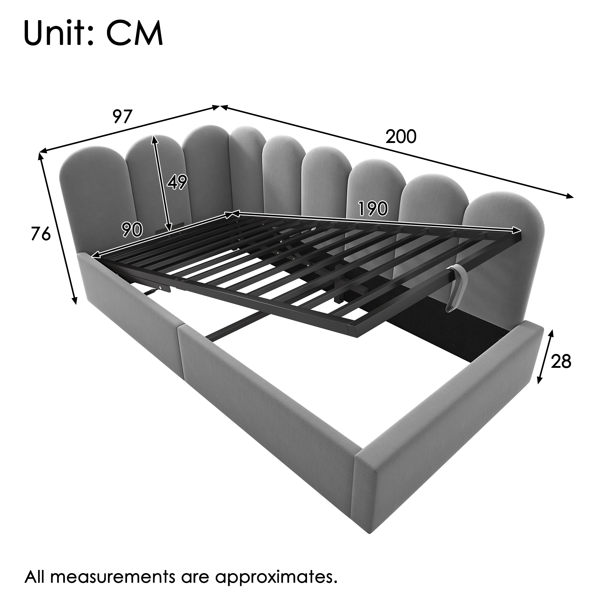 - Combo ItemProduct Name:Upholstered Bed Daybed with Storage, 3FT Single Sofa Bed 90 x 190 cm, Daybed with Hydraulic Storage, Bed Frame with Metal Slatted Frame, Velvet, Grey (No Mattress)Main Color:GreyMain Material:VelvetBed Size:90cm*190cmProduct DimensionsAssembled Length (cm):200.00Assembled Width (cm):97.00Assembled Height (cm):76.00Product Weight (kg):37.00Package SizeSub-item 1: N601P272132GPackage Quantity: 1104.78 * 38.74 * 18.03 cm 24 kgSub-item 2: N601P272131GPackage Quantity: 1111.13 * 79.38 * 12.07 cm 18.6 kgProduct Features【SMALL SPACE-FRIENDLY DESIGN】 The unique shape of this daybed creates a kid-friendly atmosphere. The bed frame is L-shaped with interchangeable side panels to accommodate different room configurations, making it ideal for small spaces or flats and guest rooms.【PRACTICAL STORAGE FUNCTION】 This sofa bed is equipped with a hydraulic system that allows the slatted frame to be easily lifted by fabric pulls. It increases the overall functionality of the bed and provides more storage space for blankets, pillows and other miscellaneous items. The sofa bed is equipped with two stoppers to prevent the mattress from slipping, ensuring your stability while in use.【SKIN-FRIENDLY MATERIAL】The bed is made of velvet fabric, which feels soft and skin-friendly. Thickened foam backrest makes you feel comfortable while resting on the bed. The streamlined shape not only gives you a comfortable feeling, but also effectively reduces injuries from sharp corners and edges that you or your family may suffer during use.【STURDY SLATTED BASE】 The slatted base is made of high-quality iron to ensure durability and stability. The contact surfaces of the iron parts are covered with an EVA sound-absorbing membrane, which not only increases comfort and quietness during use, but also extends the life of the sofa bed.【DETAILE INFORMATION】 To minimize the risk of damage during shipping, the bed frame is delivered in two separate packages, which may arrive on different days. The clear instructions that come with every purchase are also available online.* If both packages have arrived but parts are missing, please contact our customer service team for assistance.