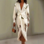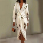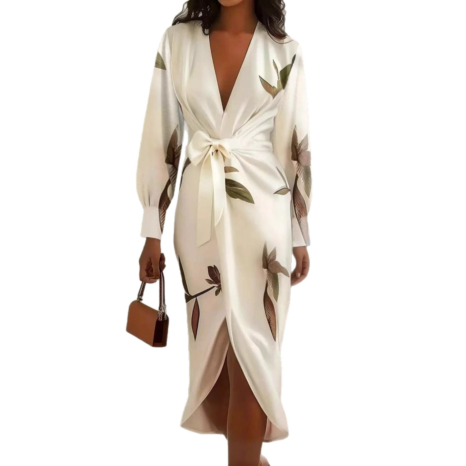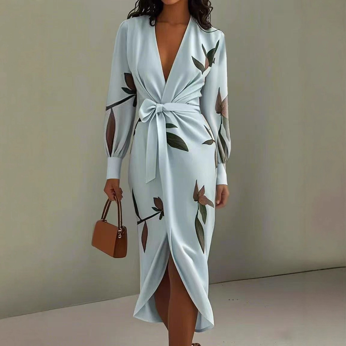 V-neck Long-sleeve Lace-up Printed Maxi Dress
