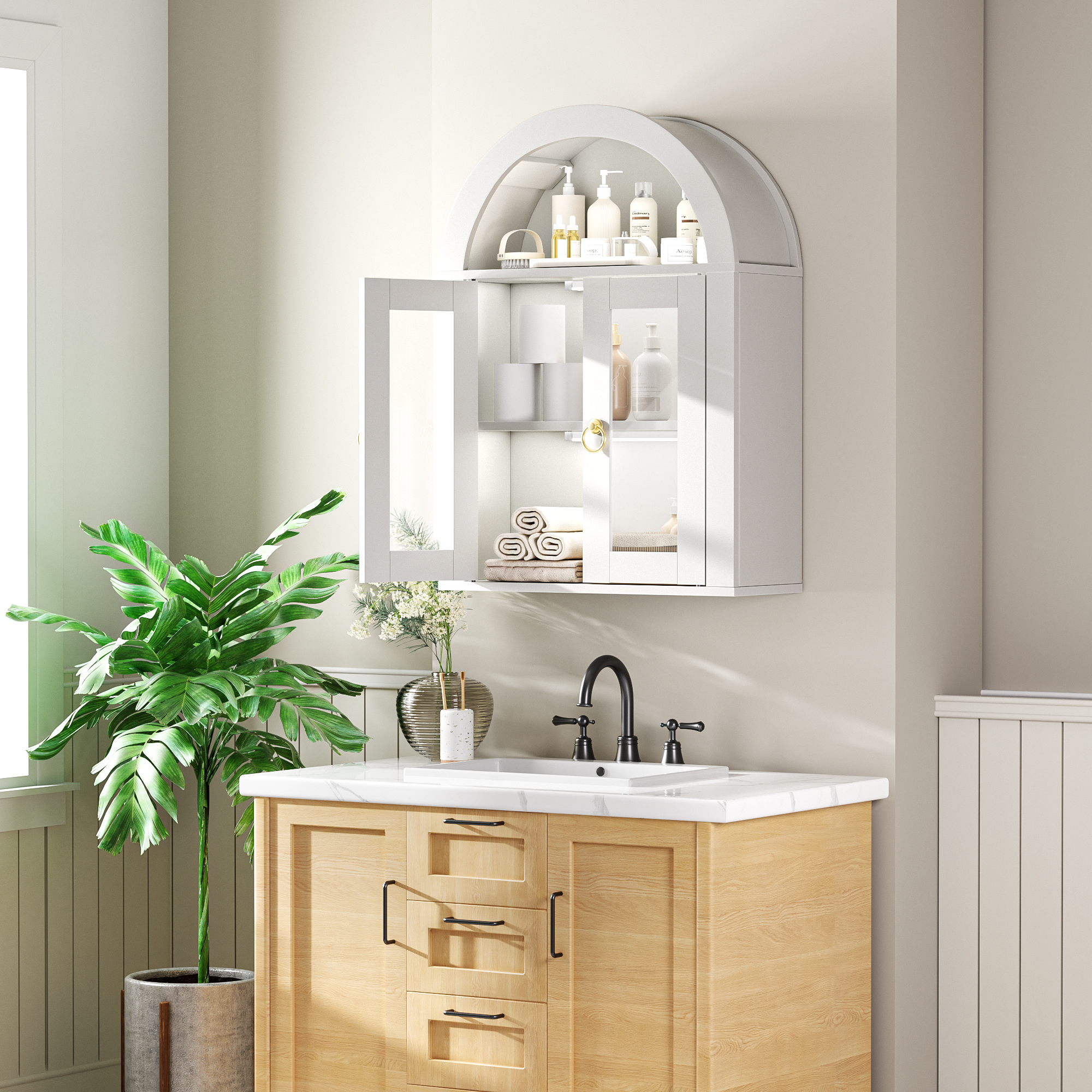 Be the first to review “Wall Mounted Arched Cabinet With Glass Doors, Light And Adjustable Shelves For Laundry Room, Bathroom, Kitchen”