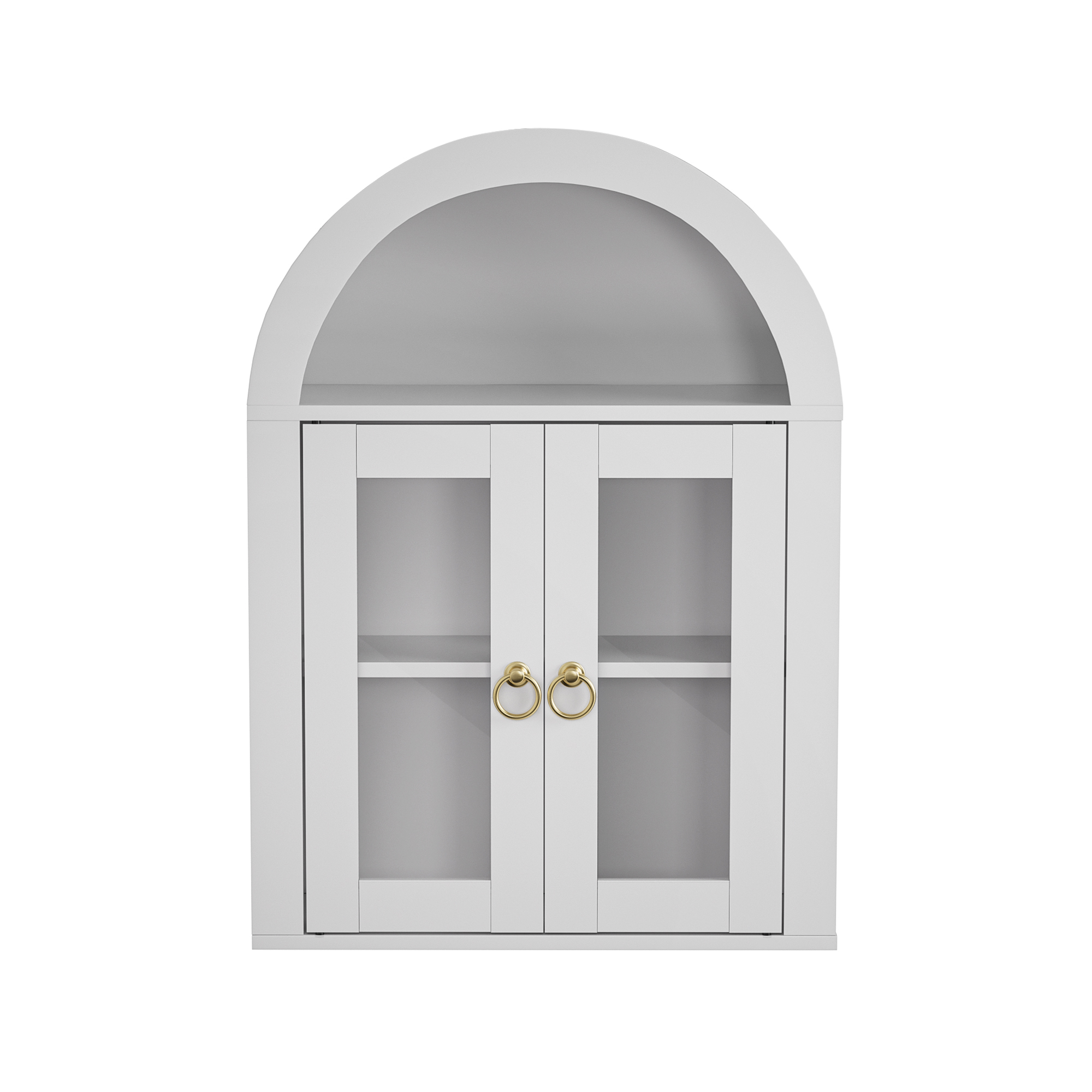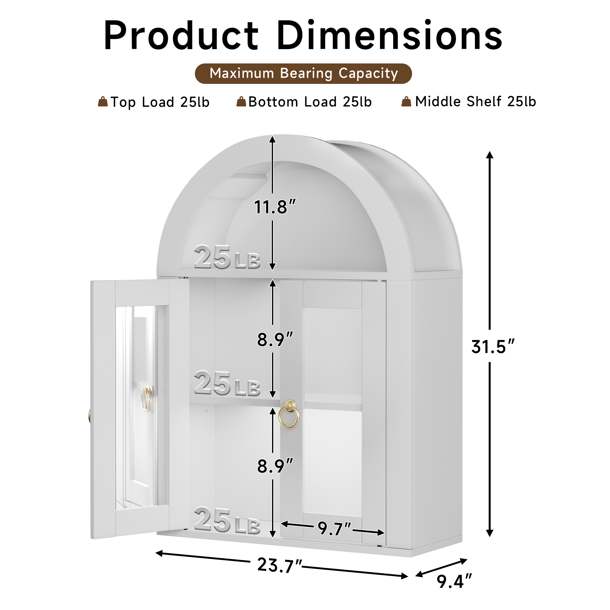 • Single Box ProductProduct Name:Wall Mounted Arched Cabinet with Glass Doors, Light and Adjustable Shelves for Laundry Room, Bathroom, KitchenMain Color:WhiteMain Material:MDF+glassProduct DimensionsAssembled Length (in.):23.70Assembled Width (in.):9.40Assembled Height (in.):31.50Product Weight (lbs.):29.28Package SizeLength (in.):28.35Width (in.):16.14Height (in.):8.27Weight (lbs.):34.28