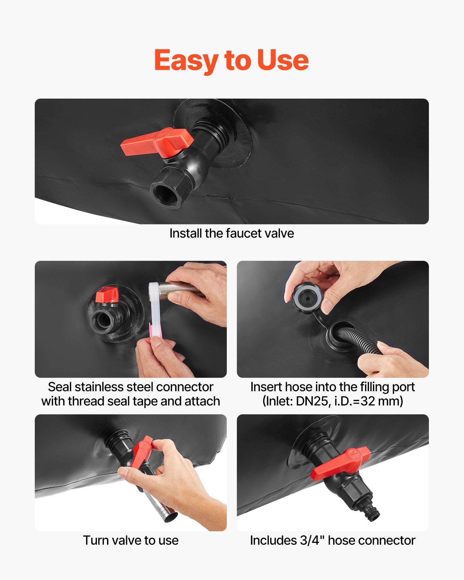 • The collapsible water storage bladder bag comes with pre-installed inlet (DN25, 32mm male thread) and outlet (DN20, 25mm male thread) fittings. Simply attach the faucet at the outlet and connect a garden hose to fill. Ready to use in minutes