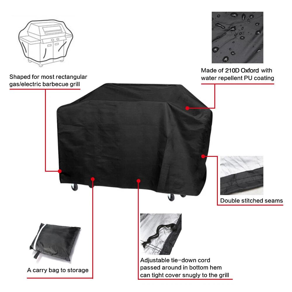 Waterproof Grill Cover【Heavy – Duty Grill Protection】: This black BBQ grill cover blocks UV rays, is color – fast and fade – resistant, and protects against rain, snow rain, snow, water, and more.【Wind – Resistant Drawstrings】: The bottom of each grill cover can be tightly secured with a built – in drawstring to prevent the cover from being blown away in strong winds.【Brand Versatility】: This charcoal and gas grill cover fits a variety of brands, models, and manufacturers, including Brinkmann, Char Broil, Weber, Holland, and more.【All – Weather Durability】: Made of 210D/300D Oxford fabric and PVC – coated, this robust BBQ grill cover is tear – resistant, waterproof, sun – proof, and weather – proof.【Product Specifications】 100% Brand New and High – Quality : 100% brand new and of high quality. Material : Durable 210D Denier Oxford Cloth. Color : Black.【Product Description】 Made of durable 210D/300D Denier Oxford Cloth, it is strong and the best choice for your grill. Waterproof and corrosion – resistant, protecting your grill from rain and frost. shielding your grill from dust and sun, keeping it clean and like new. Adjustable ties through built – in plastic grommets to ensure the cover stays in place in windy conditions. Suitable for most rectangular gas grills. Good sewing with durable protective straps. Due to the tough material, it is not easy to tear. Easy to wash and clean, with safety vents.【Dimensions】 Size : Approximately 145x61x117cm/57.09″x24.02″x46.06″(L x W x H).【Sales Packaging】None.【Quantity】1PC per order.