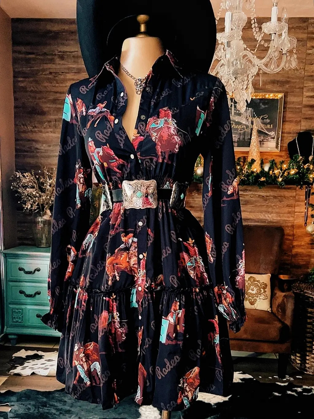 Western Cowboy-Style Printed Long-Sleeve Dress