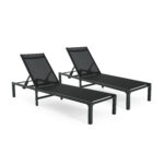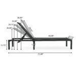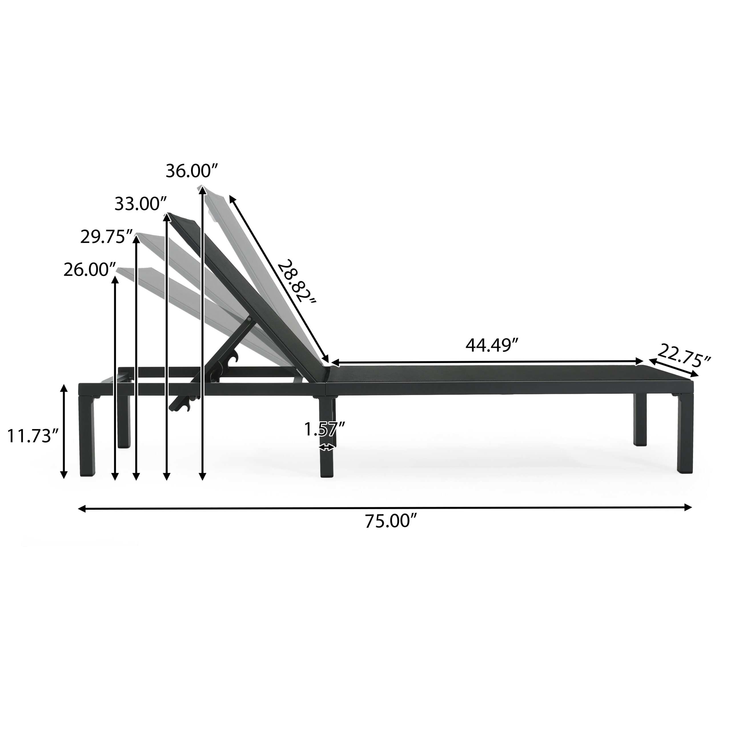 SpecificationProduct Information Product Type :Single Box ProductProduct Name:Westport Outdoor Chaise Lounge (Set of 2)Main Color:BlackMain Material:AluminumProduct DimensionsAssembled Length (in.):74.80Assembled Width (in.):22.83Assembled Height (in.):11.81Product Weight (lbs.):16.75Package SizeLength (in.):46.50Width (in.):24.25Height (in.):10.00Weight (lbs.):42.77Product FeaturesAdjustable Backrest: Featuring an adjustable backrest which can be reclined into 4 different positions, this patio chaise lounge will satisfy your different relaxing needs. You can sit to read, recline to take a sunbath and do many other activities. You can even lie flat to take a sound sleep.Heavy-Duty Aluminum Frame: The main frame of this chaise lounge is constructed of top-grade aluminum pipes, which are lighter than steel pipes, but still as sturdy as steel pipes. Moreover, the aluminum resists to rust well, ensuring long-lasting service life. The non-slip footpads protect the ground well from scratches.Comfortable & Durable Seat Fabric: The sitting area and backrest are made of premium fabric which is rip resistant, colorfast and wearable. Also,the fabric is breathable and easy to dry, keeping you always stay cool. The extended backrest will make you more relaxed when sitting on the chaise lounge.Relax Anywhere You Want: This chaise lounge is comfortable to sit and simple to adjust, which is perfect for different occasions. And it weighs only 13 lbs, so you can move it by yourself to any places you want. It’s perfect for both indoor and outdoor scenarios, such as poolside,backyard and home.Inchude: Two(2) Chaise Lounges