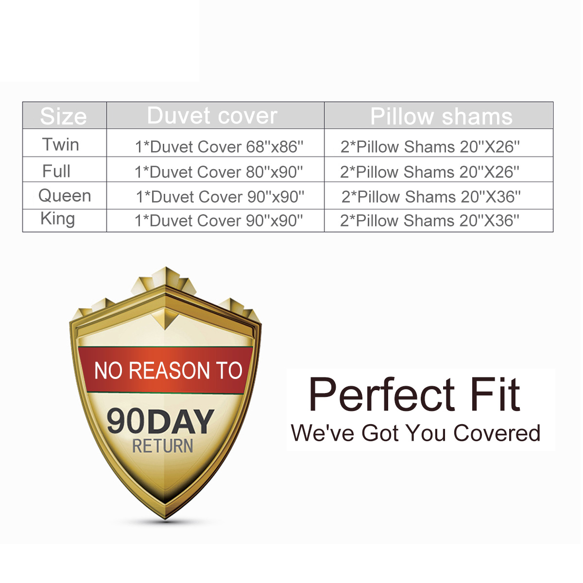 1.ATTENTION: Twin set come with one duvet cover 68″ by 86″ and two standard pillow shams 20″ by 26″; Full set come with one duvet cover 80″ by 90″ and two standard pillow shams 20″ by 26″; Queen set come with one duvet cover 90″ by 90″ and two standard pillow shams 20″ by 36″; King set come with one duvet cover 104″ by 90″ and two standard pillow shams 20″ by 36″. DOES NOT include any inside fillers and accessories. • 2.EXQUISITE WORKMANSHIP: The hidden zipper closure is convenient to put your duvet in and out, inside ties are added to keep your duvet at place. The sturdy zipper is beautifully tucked in and well-sewn, it can hold up perfectly after multiple use and washing. • 3.EFFORTLESS CLEANING: Microfiber has desirable properties such as super soft, breathing ability, reversible, wrinkle resistance, luxurious appearance and easy cleaning. You can easily wash them in the washing machine or by hand.