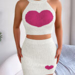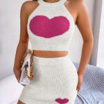 Women Casual Color Block Heart Cropped Top & Bodycon Skirt Knit Set