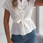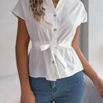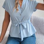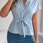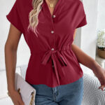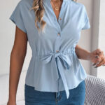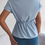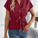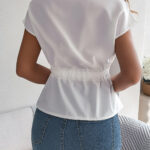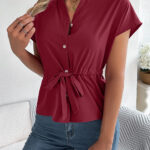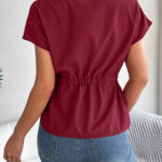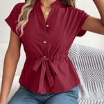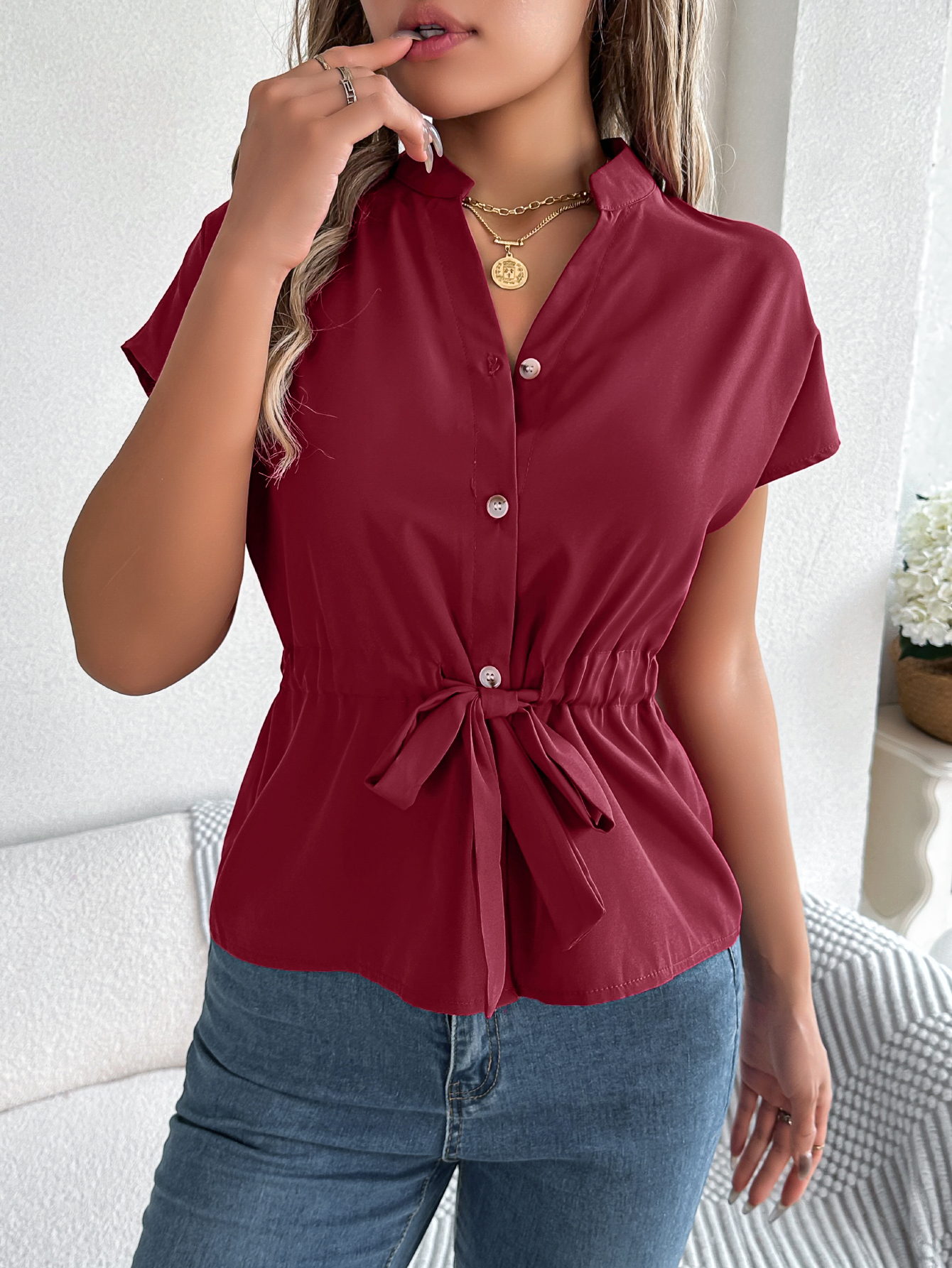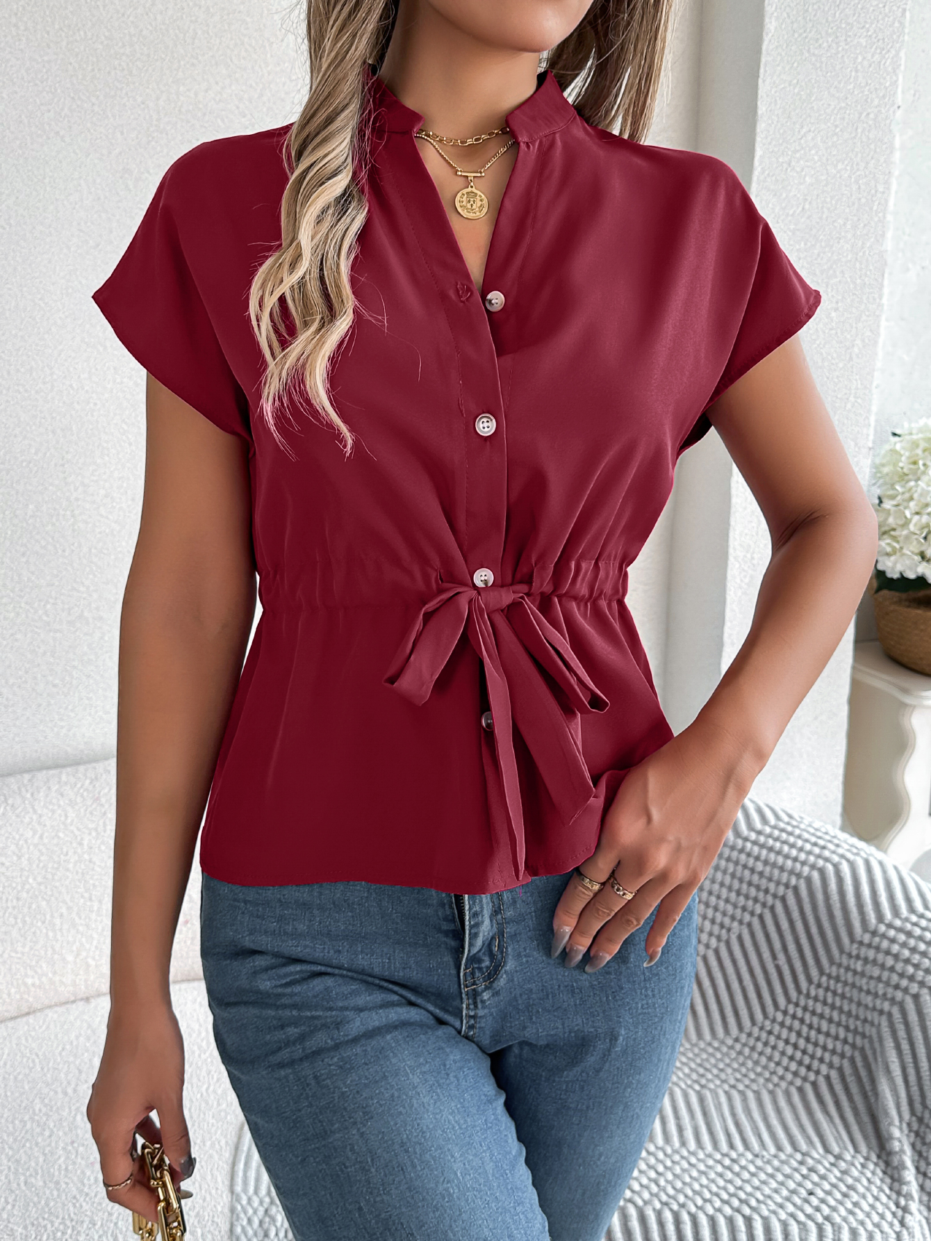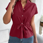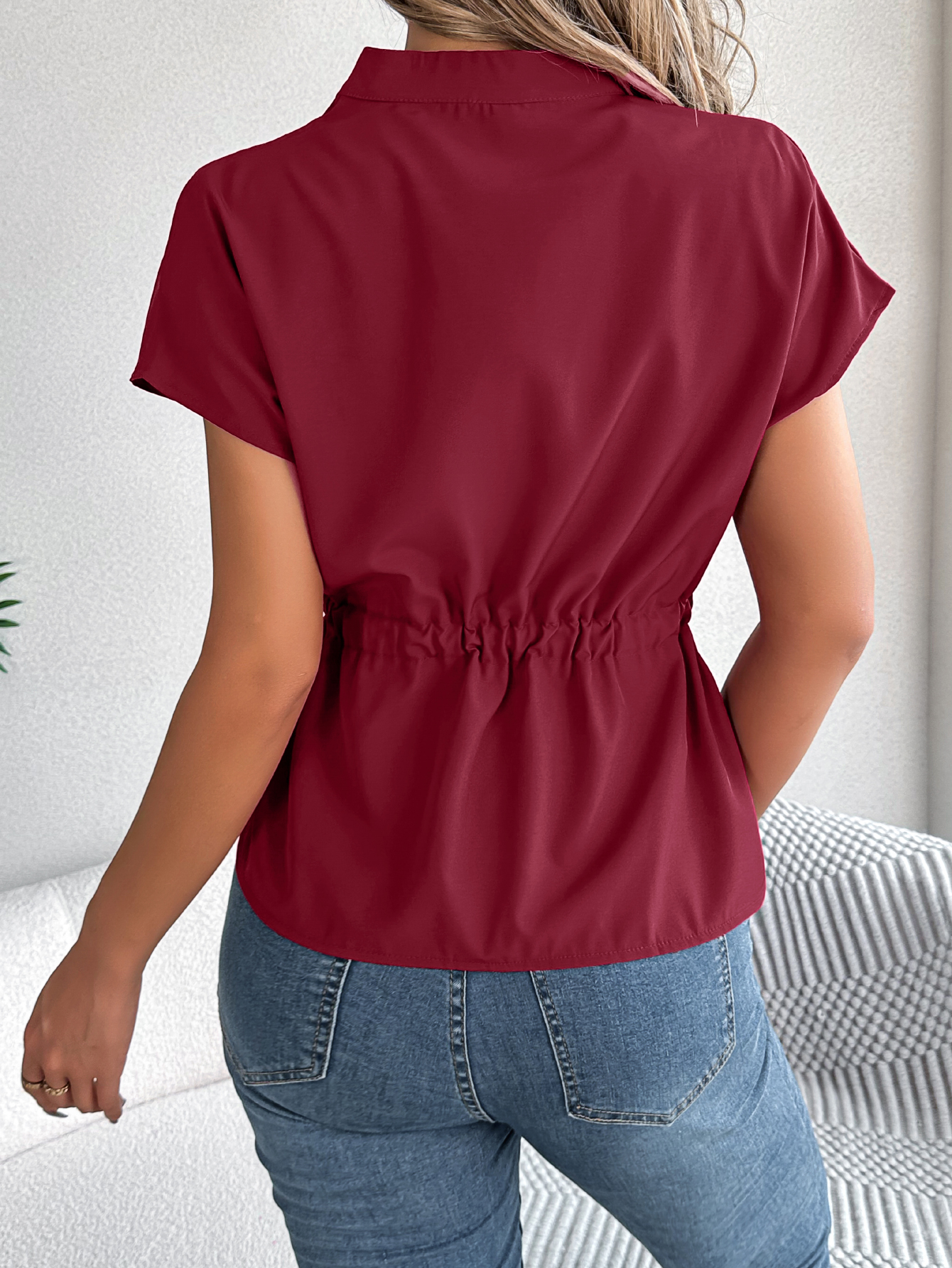 Women Casual Solid Color Button Drawstring Short Sleeve Shirt Top