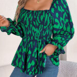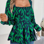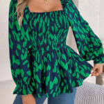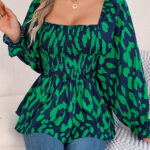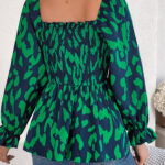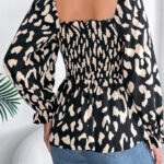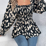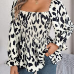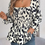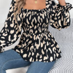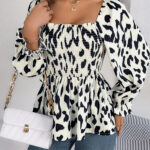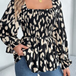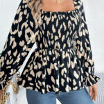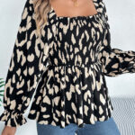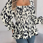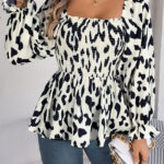 Women’s Casual Ruffle Trim Square Neck Leopard Print Long Sleeve Chiffon Top