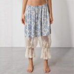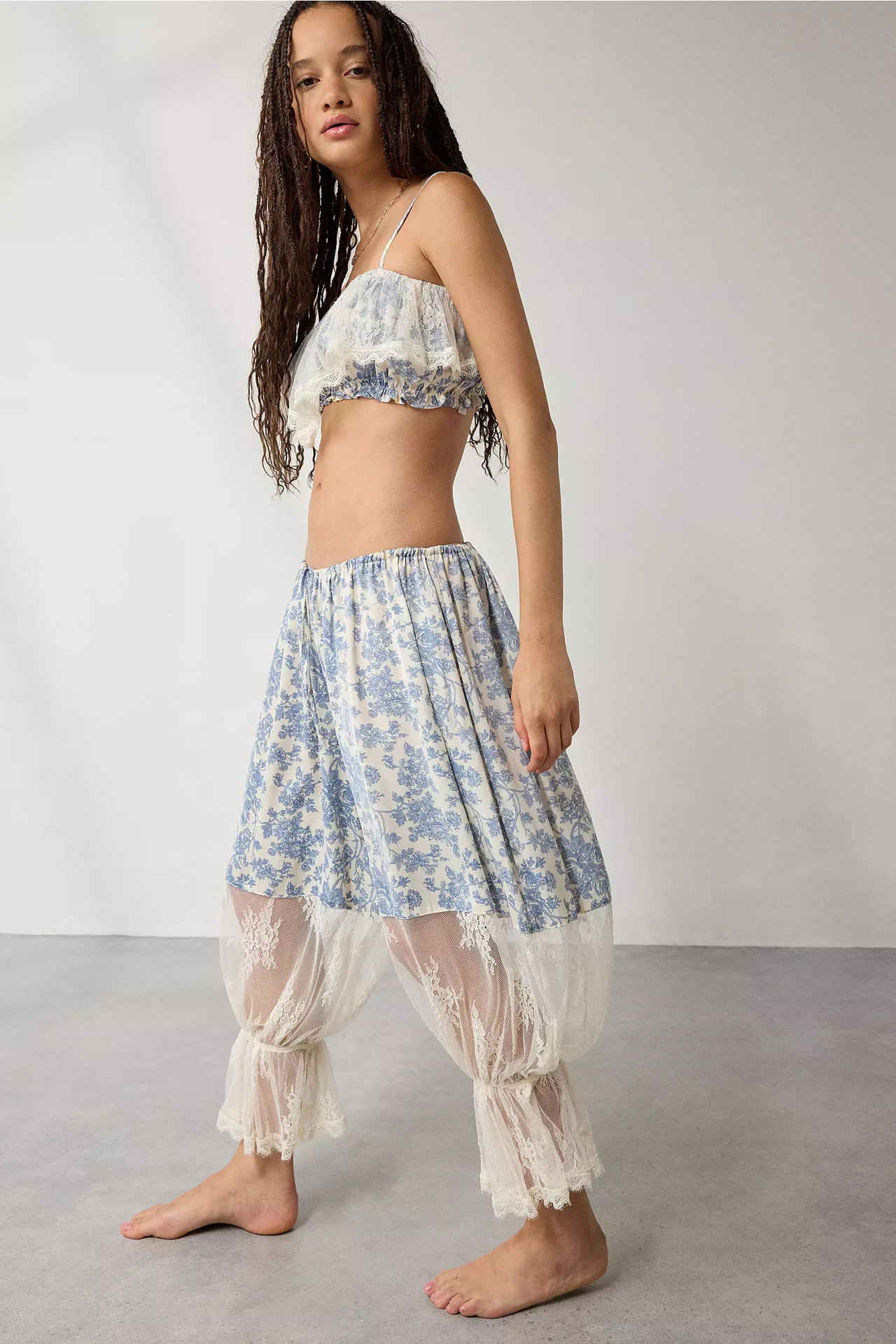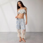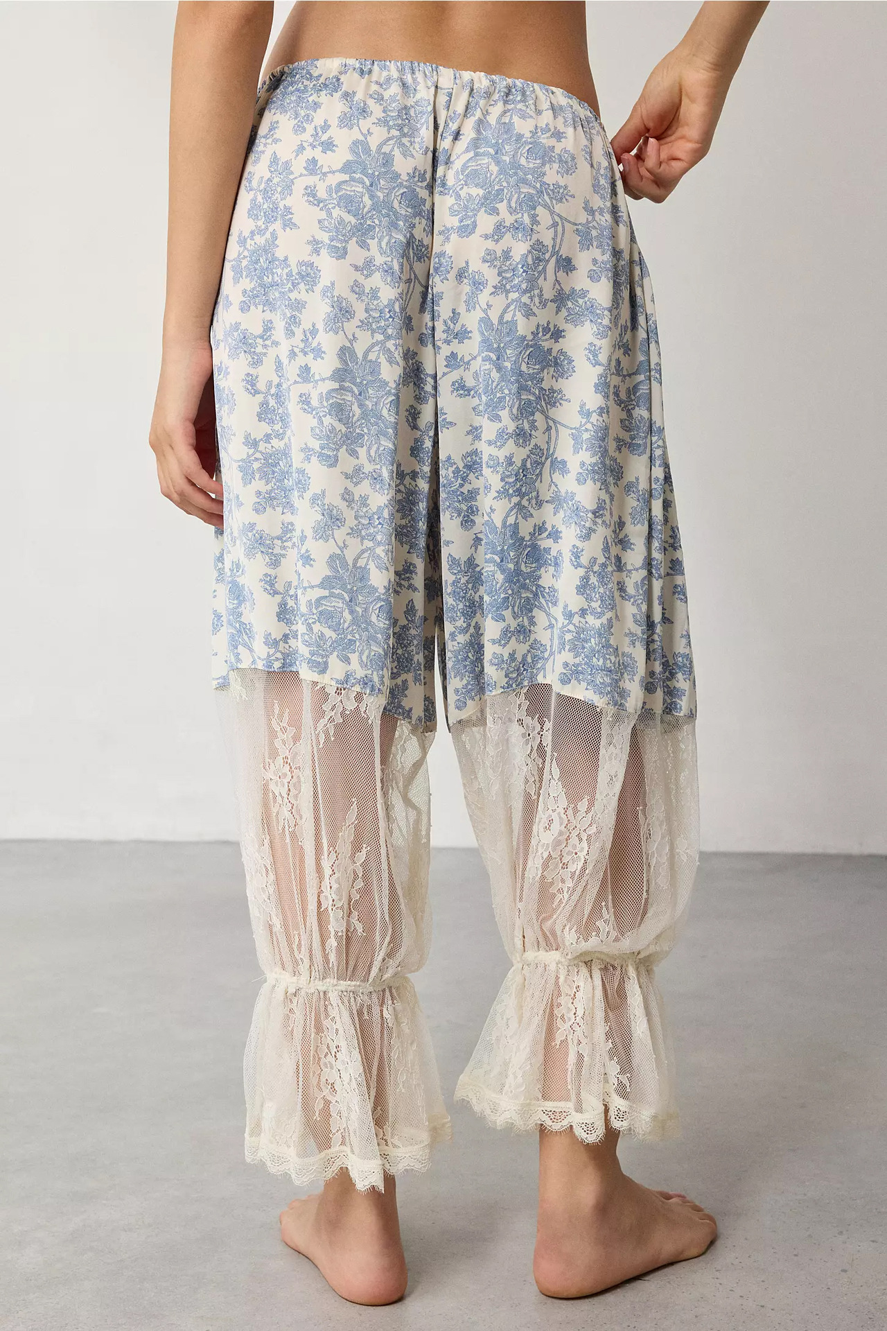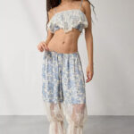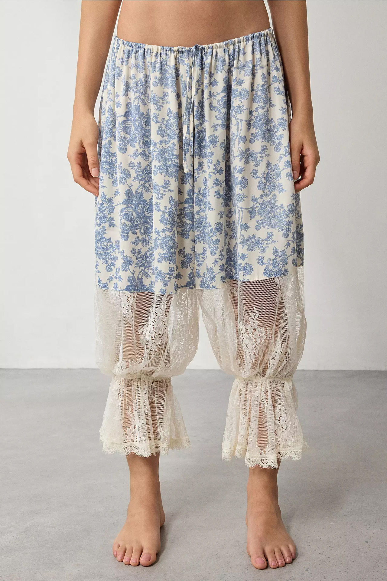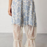 • Pleats, print, patchwork details, lace cutout accents, drawstring waistband, ankle-length wide-leg fit