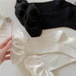 Women’s Coquette Ribbed Crew Socks With Satin Cuff, White Slouchy Knit Socks, Cute Bubble Ruffle Top Socks For Mary Jane Shoes & Balletcore