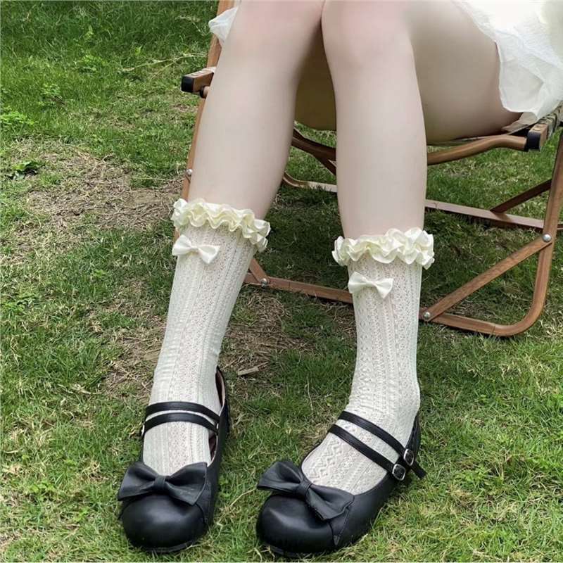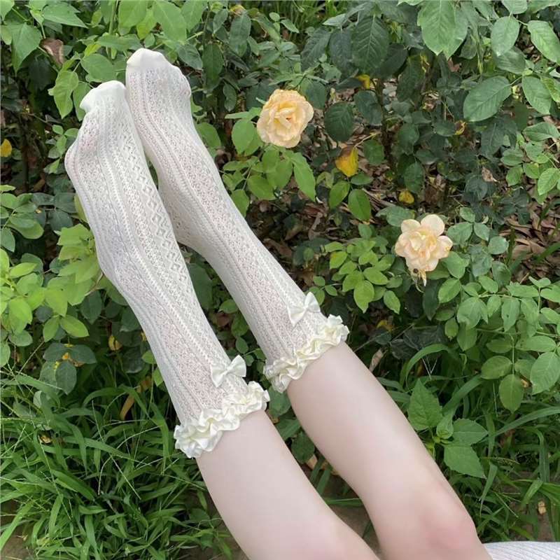 Women’s Coquette Ruffle Trim Socks, White Lace Knit Mid-Calf Socks With Bow, Cute Hollow Out Crew Socks For Lolita & Balletcore Style