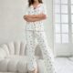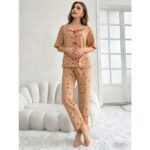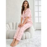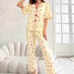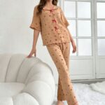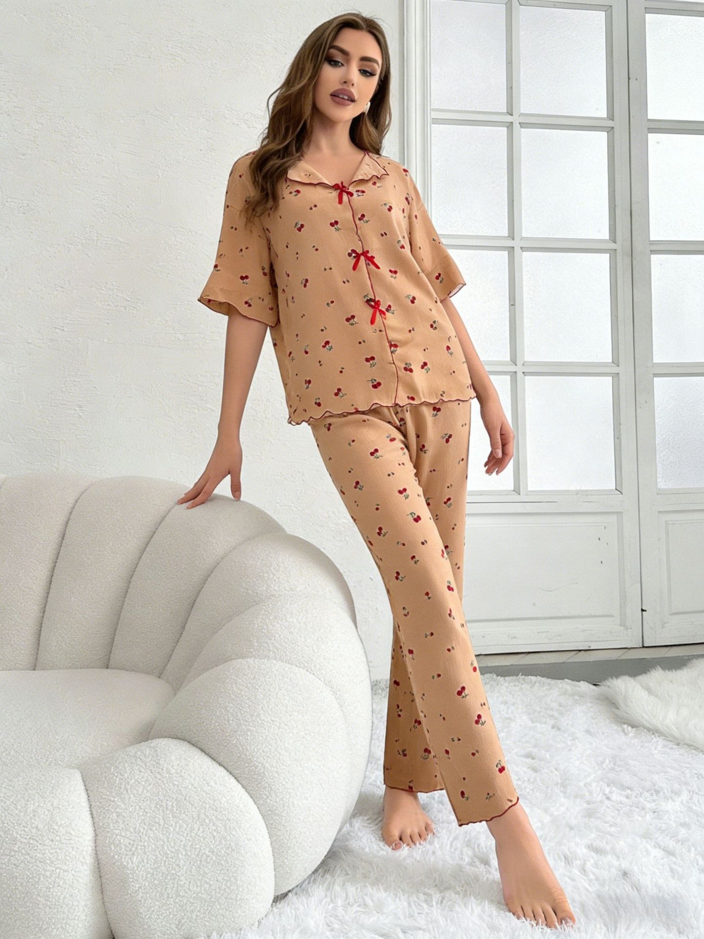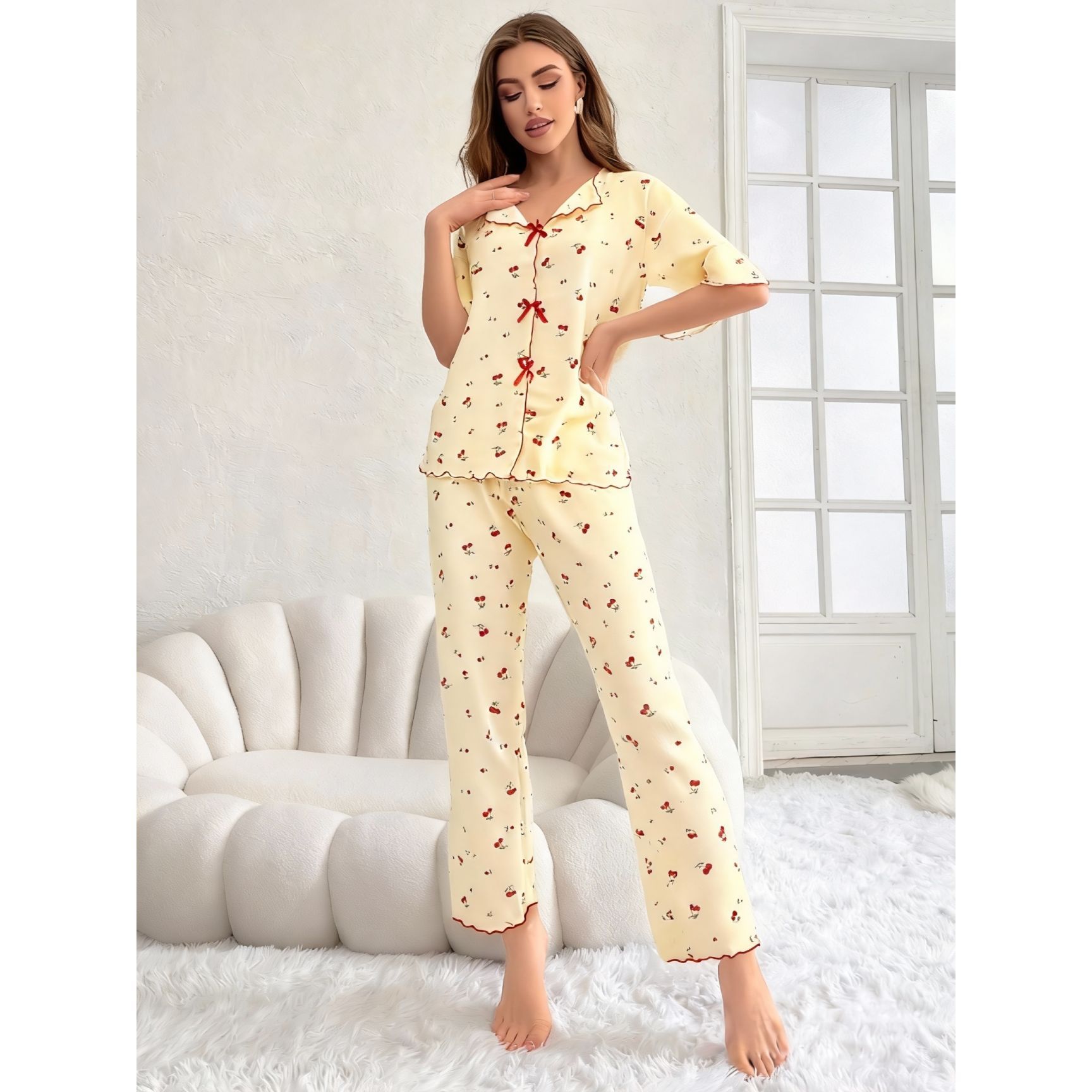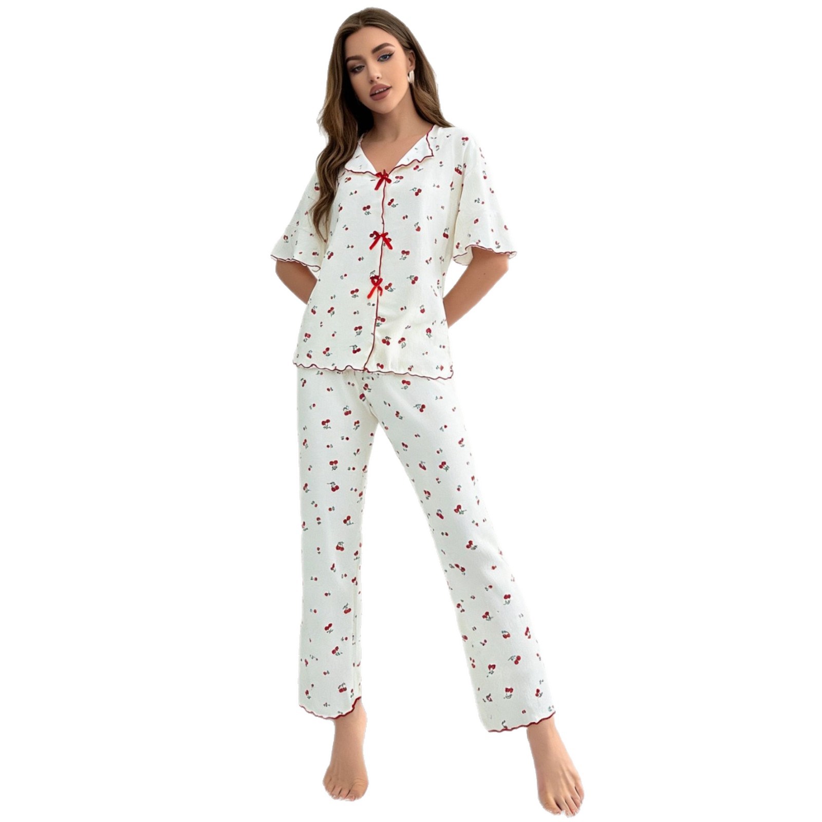 Women’s Crew-Neck Cherry-Print Short-Sleeve Top And Pants Set