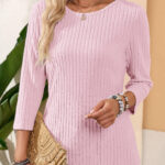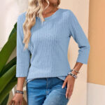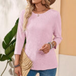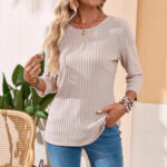 Women’s Crew-Neck Ribbed Solid-Color Top With Three-Quarter Sleeves T-Shirt