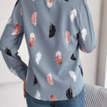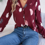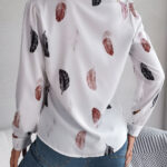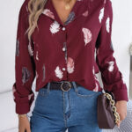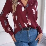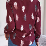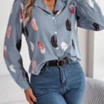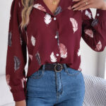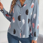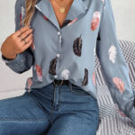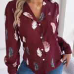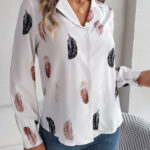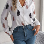 Women’s Elegant Feather Print Notched Lapel Long Sleeve Shirt