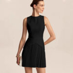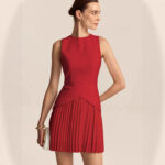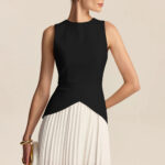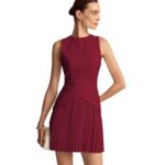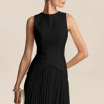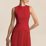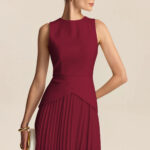 Elegant & Office-ready, Chic, Refined • Round neck, Sleeveless, Waist-cinching design, Pleated skirt, Midi length, Mid-rise waist, Batwing cut • Burgundy, Red, Black, White, Army Green, Black & White