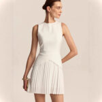 • Round neck, Sleeveless, Waist-cinching design, Pleated skirt, Midi length, Mid-rise waist, Batwing cut