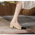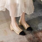 Womens French-style Soft Leather Patchwork Chanel-inspired Chunky-heel Square-toe Pumps