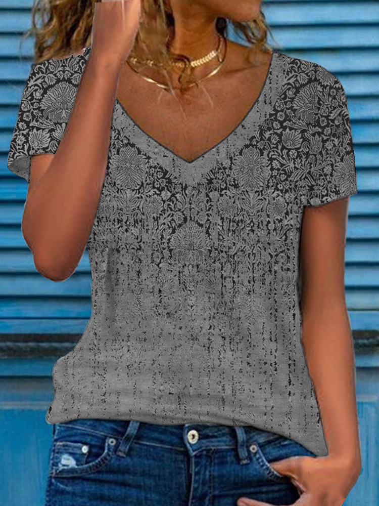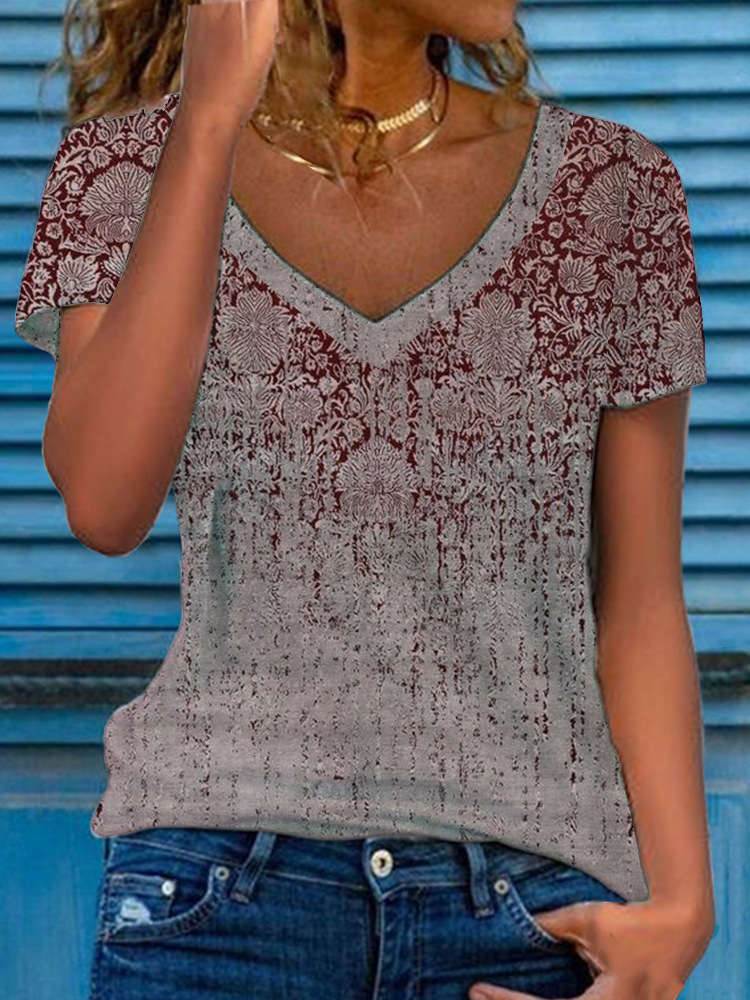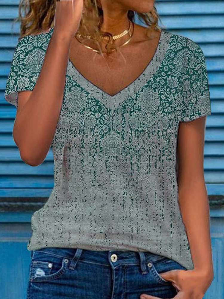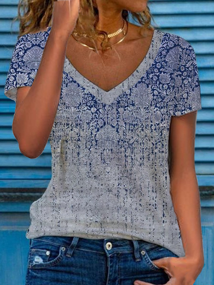 Women’s Multicolor Floral Print Short-Sleeve V-Neck Top