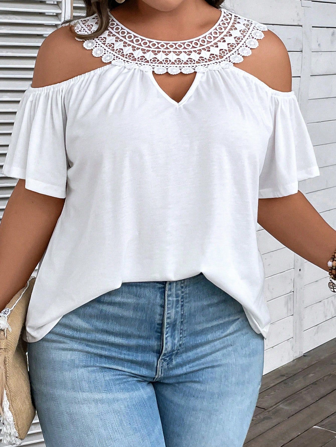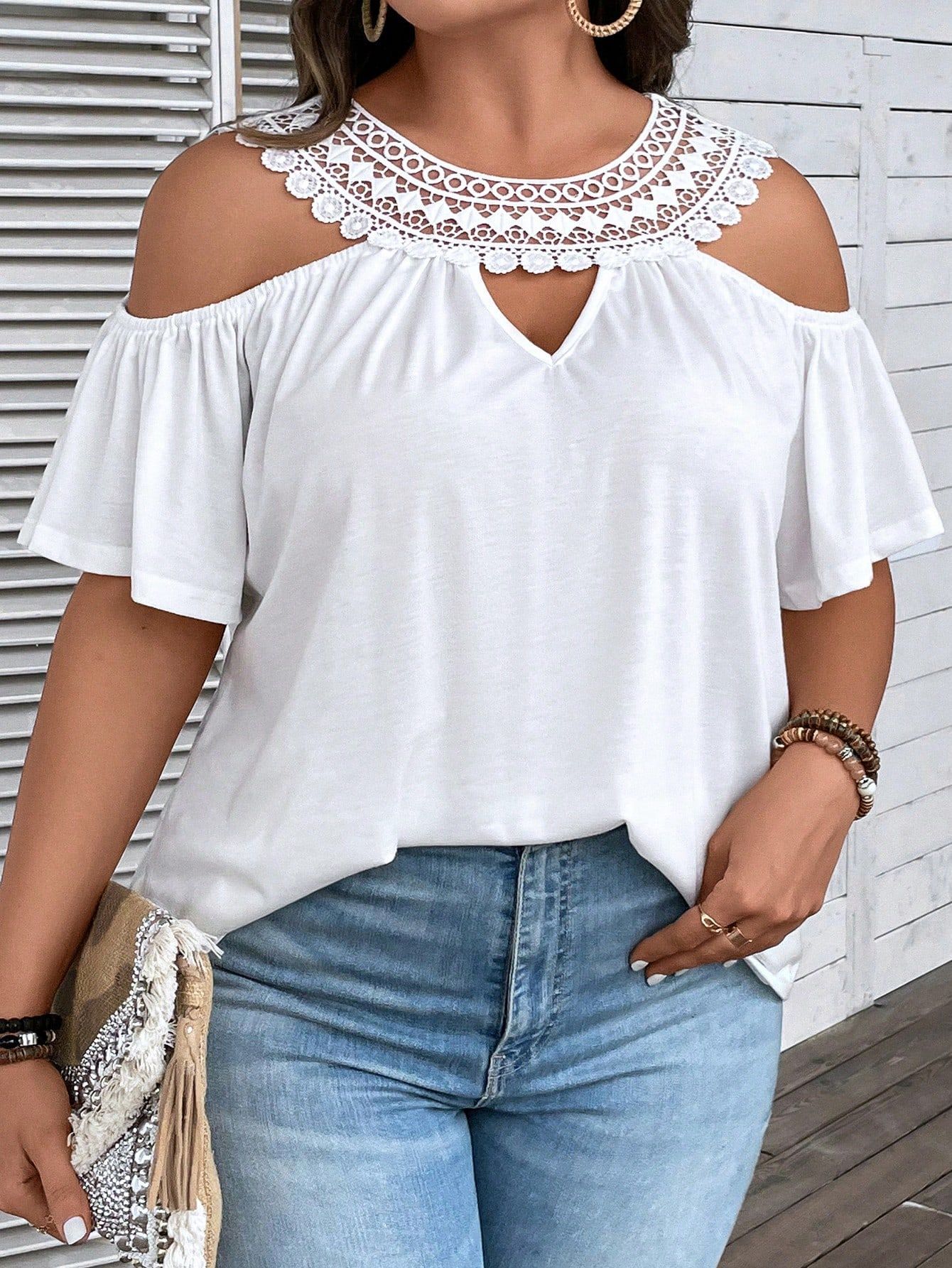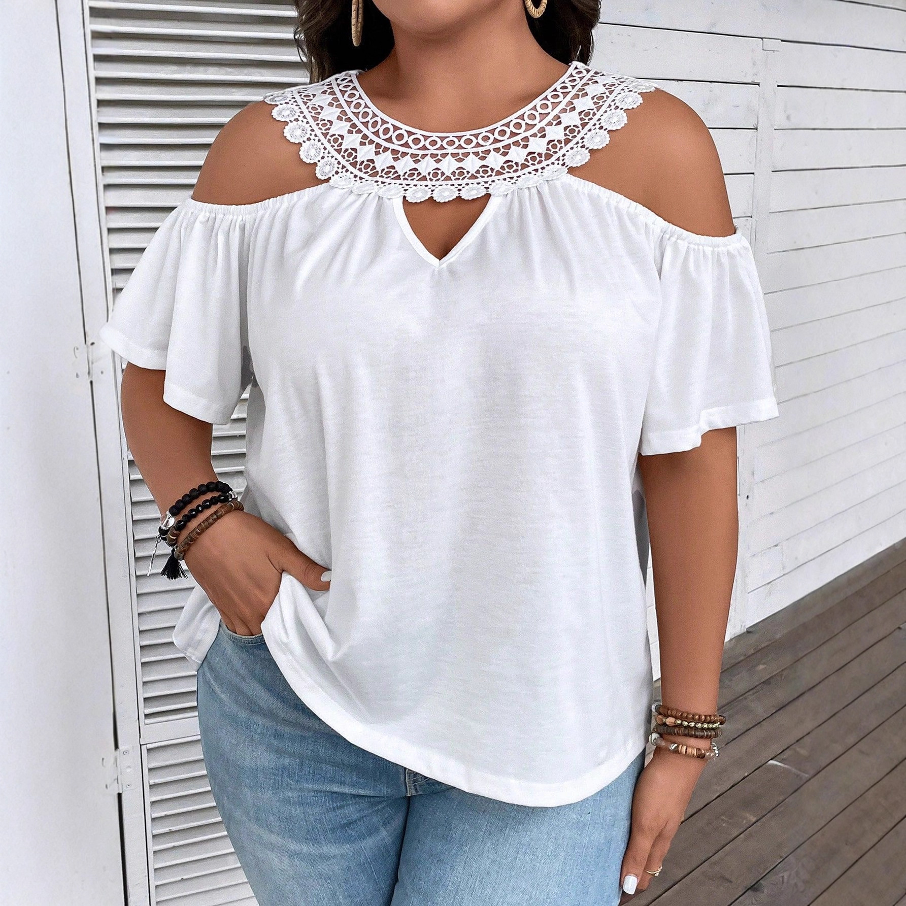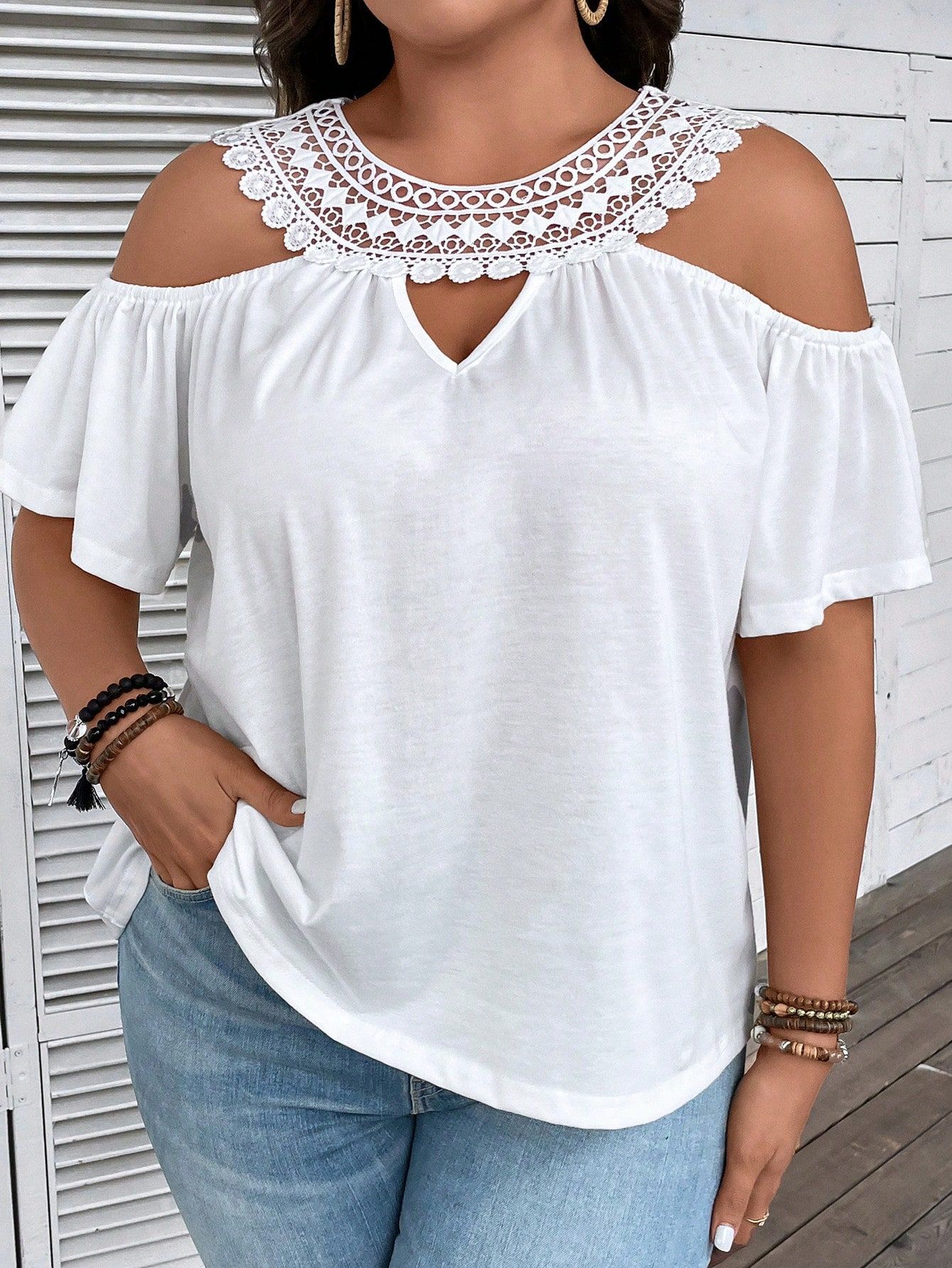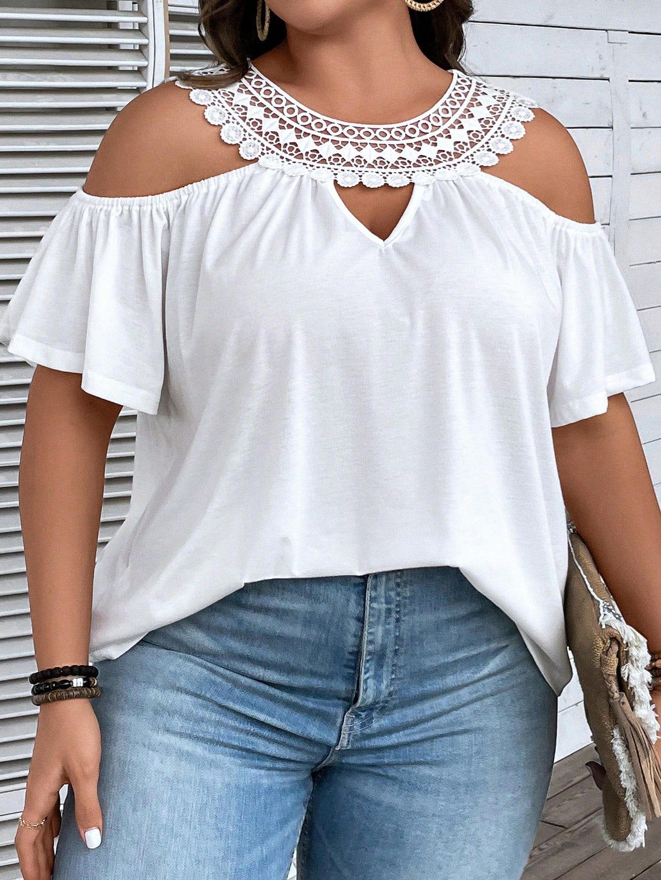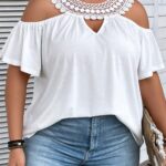 Fresh & Sweet, Preppy • Loose fit, Flared sleeves, Lace-trimmed neckline, Casual and versatile, Creative design • White