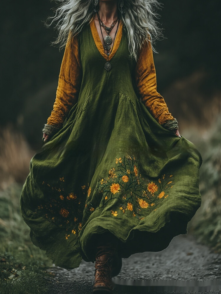 Womens Retro Bohemian Rose-Embroidered Loose Linen Maxi Dress