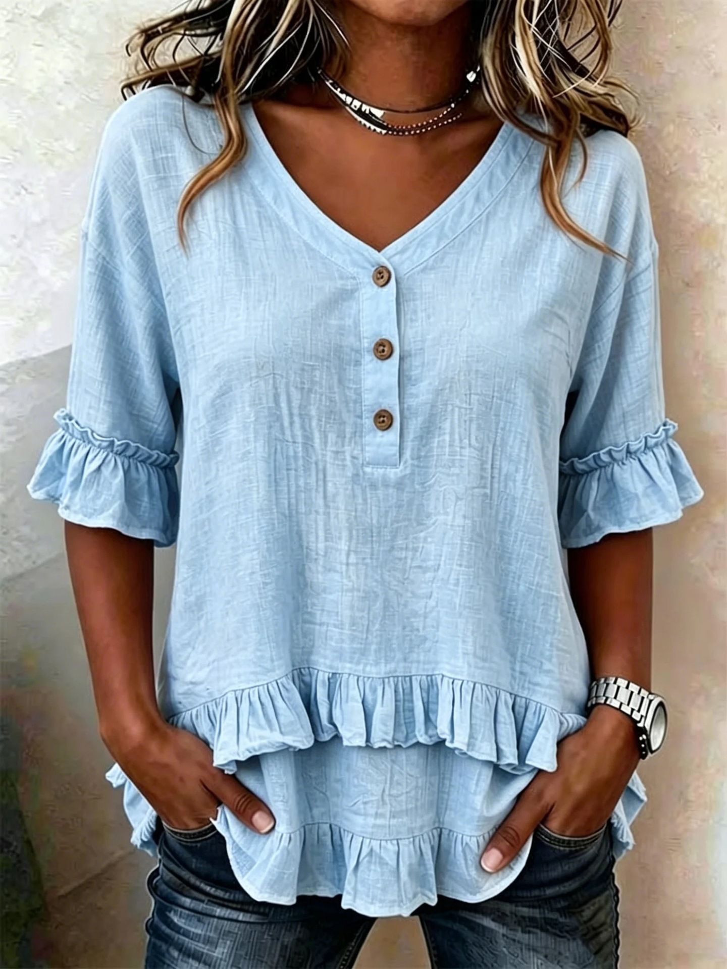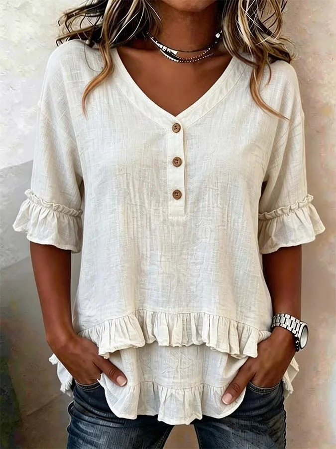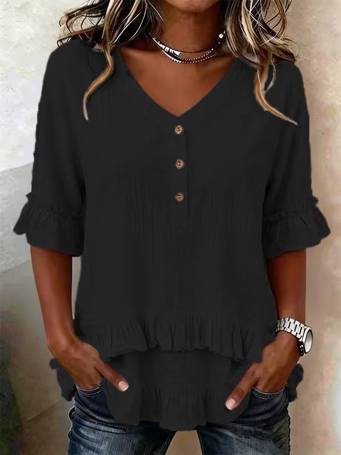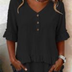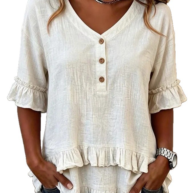 Womens Retro V-Neck Ruffled Loose Short-Sleeve Shirt is designed for style, comfort, and everyday use.