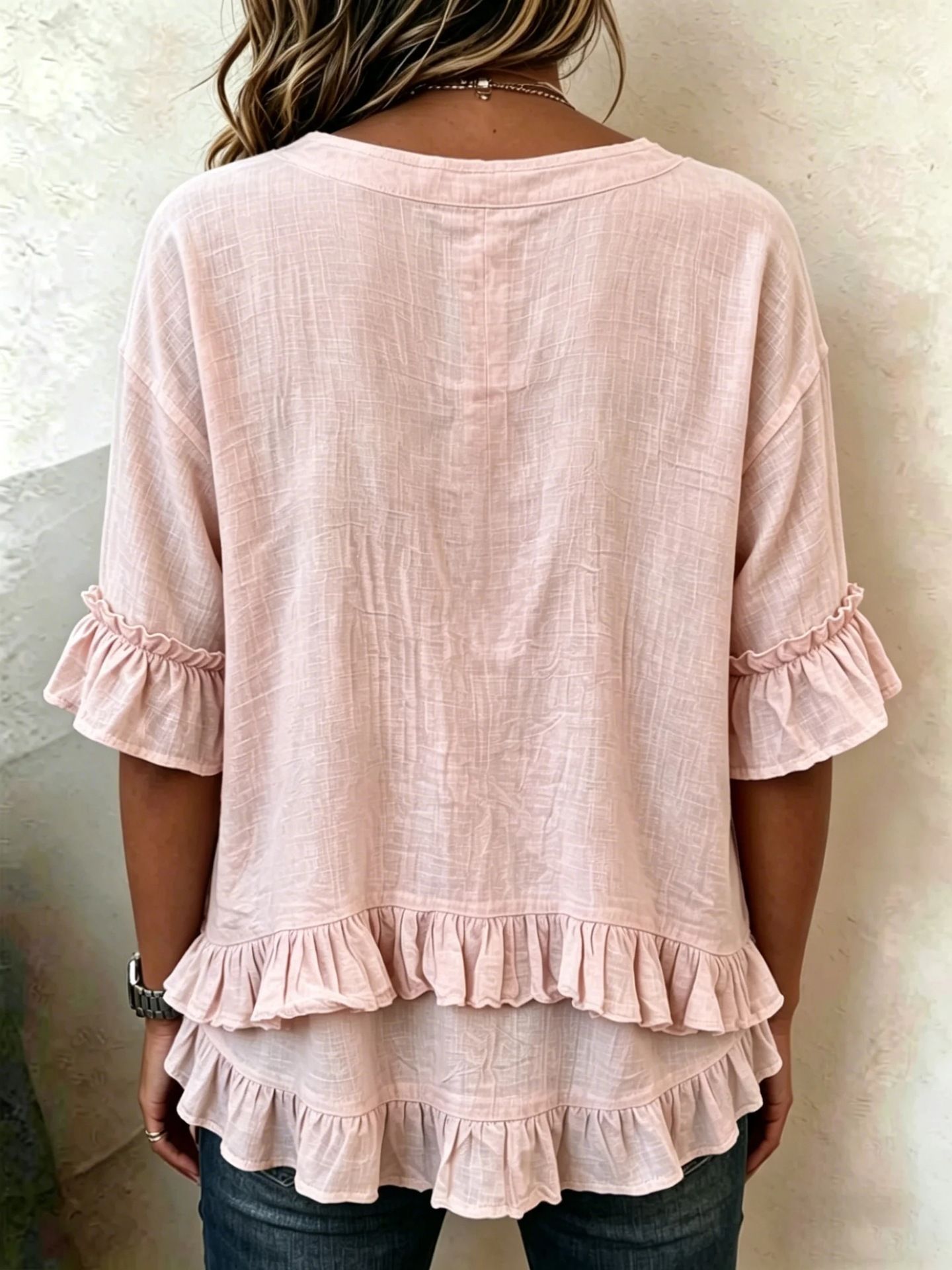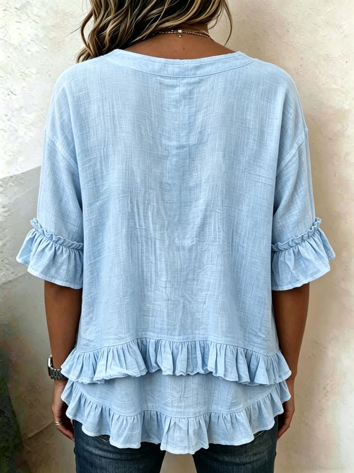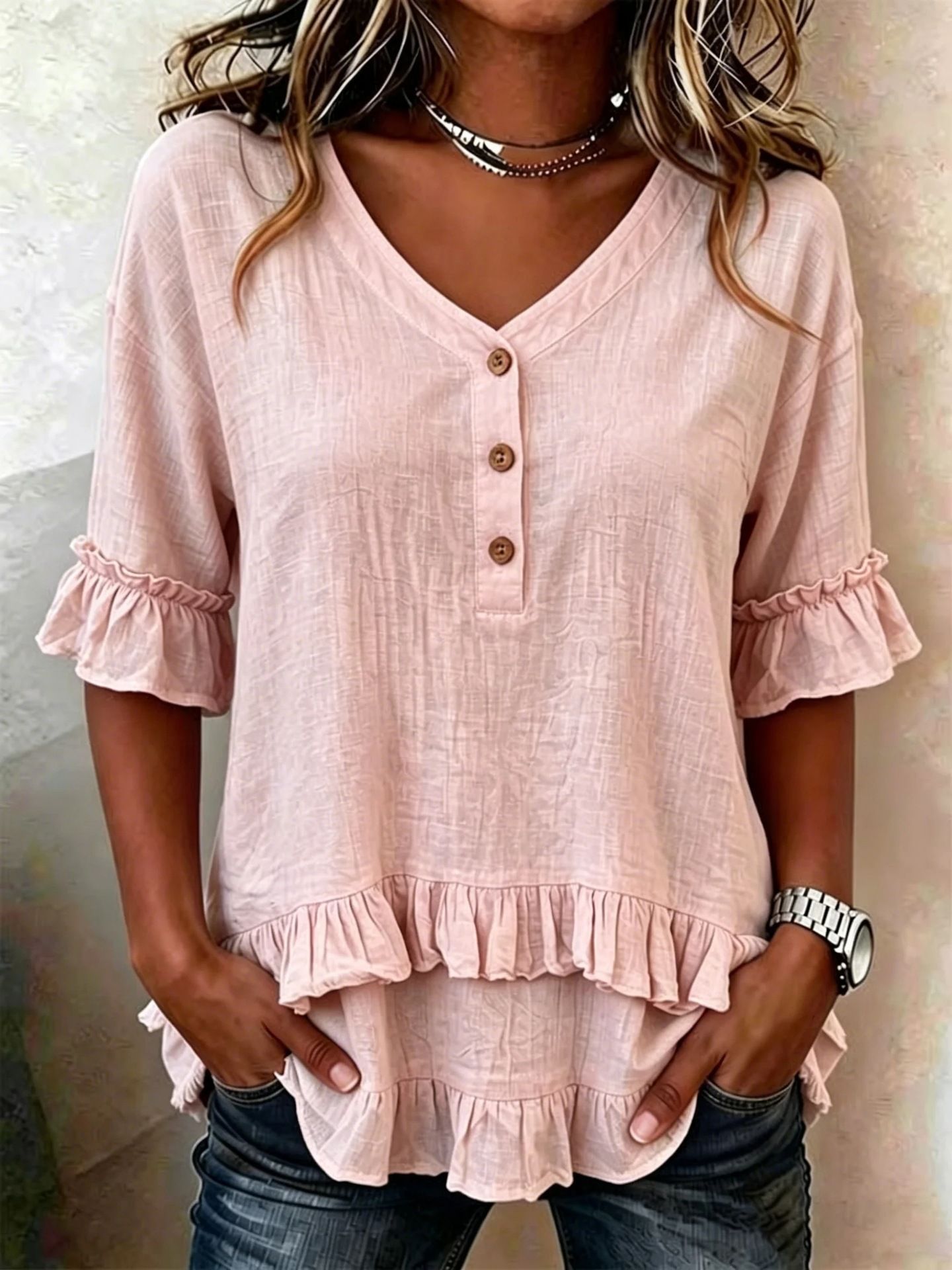 Womens Retro V-Neck Ruffled Loose Short-Sleeve Shirt is designed for style, comfort, and everyday use.