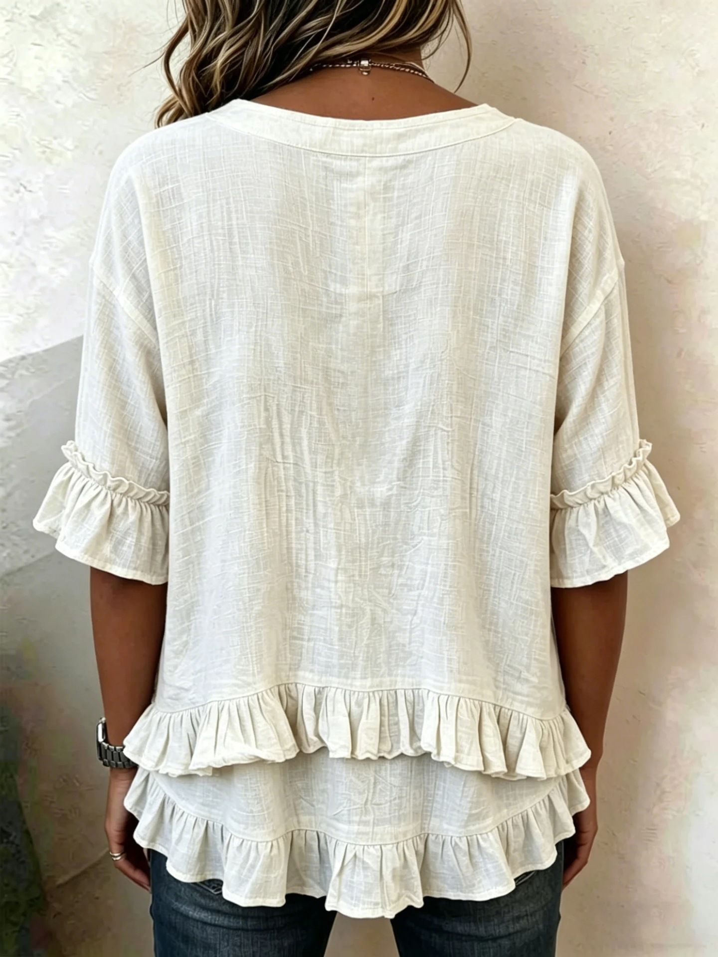 Womens Retro V-Neck Ruffled Loose Short-Sleeve Shirt