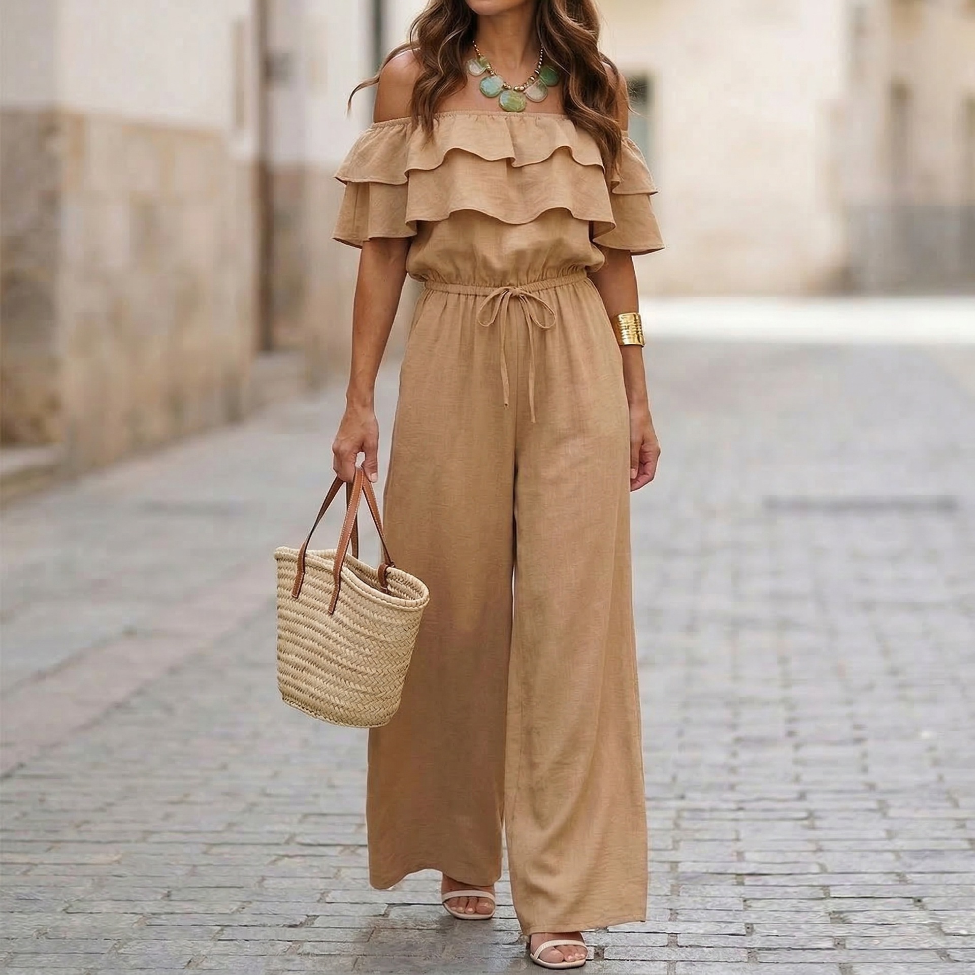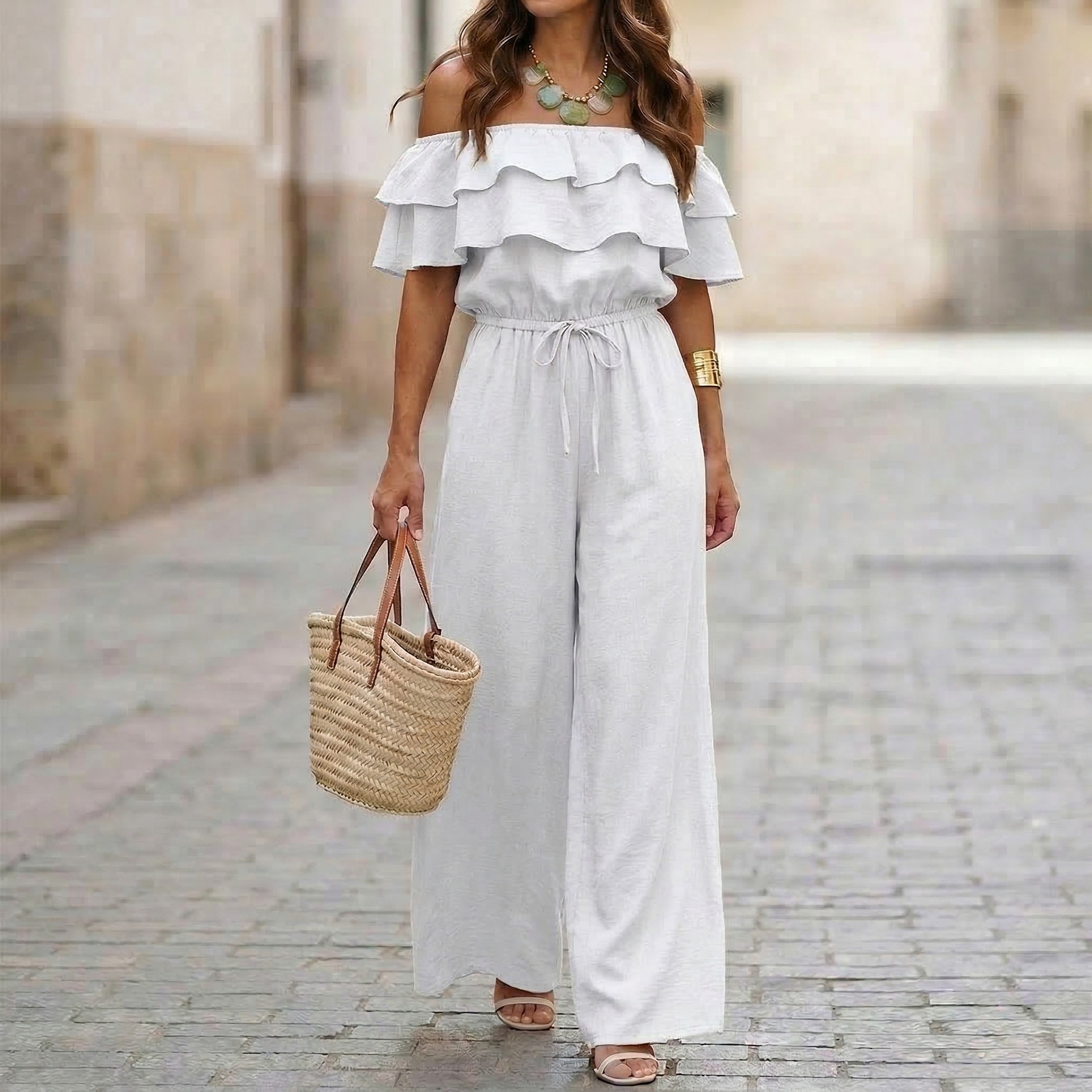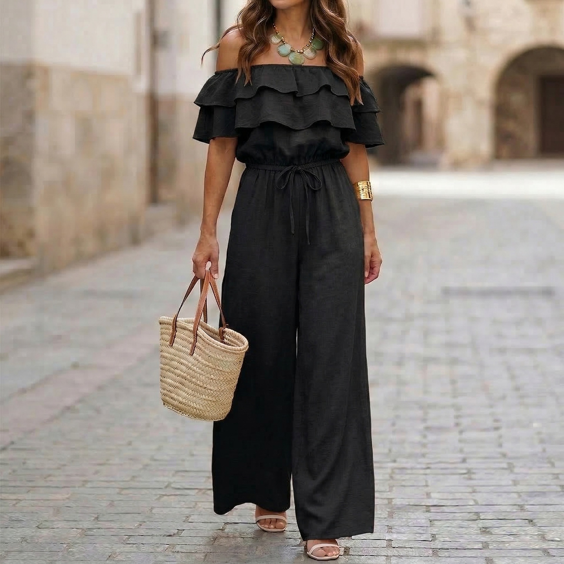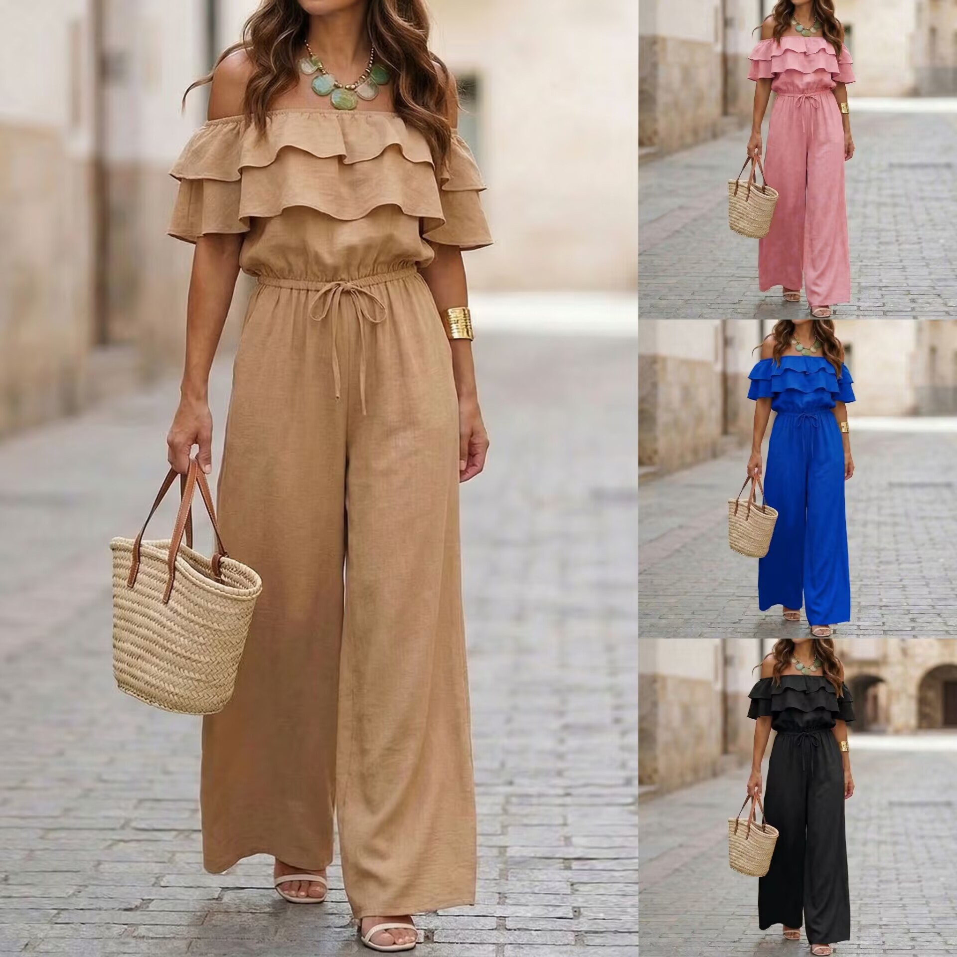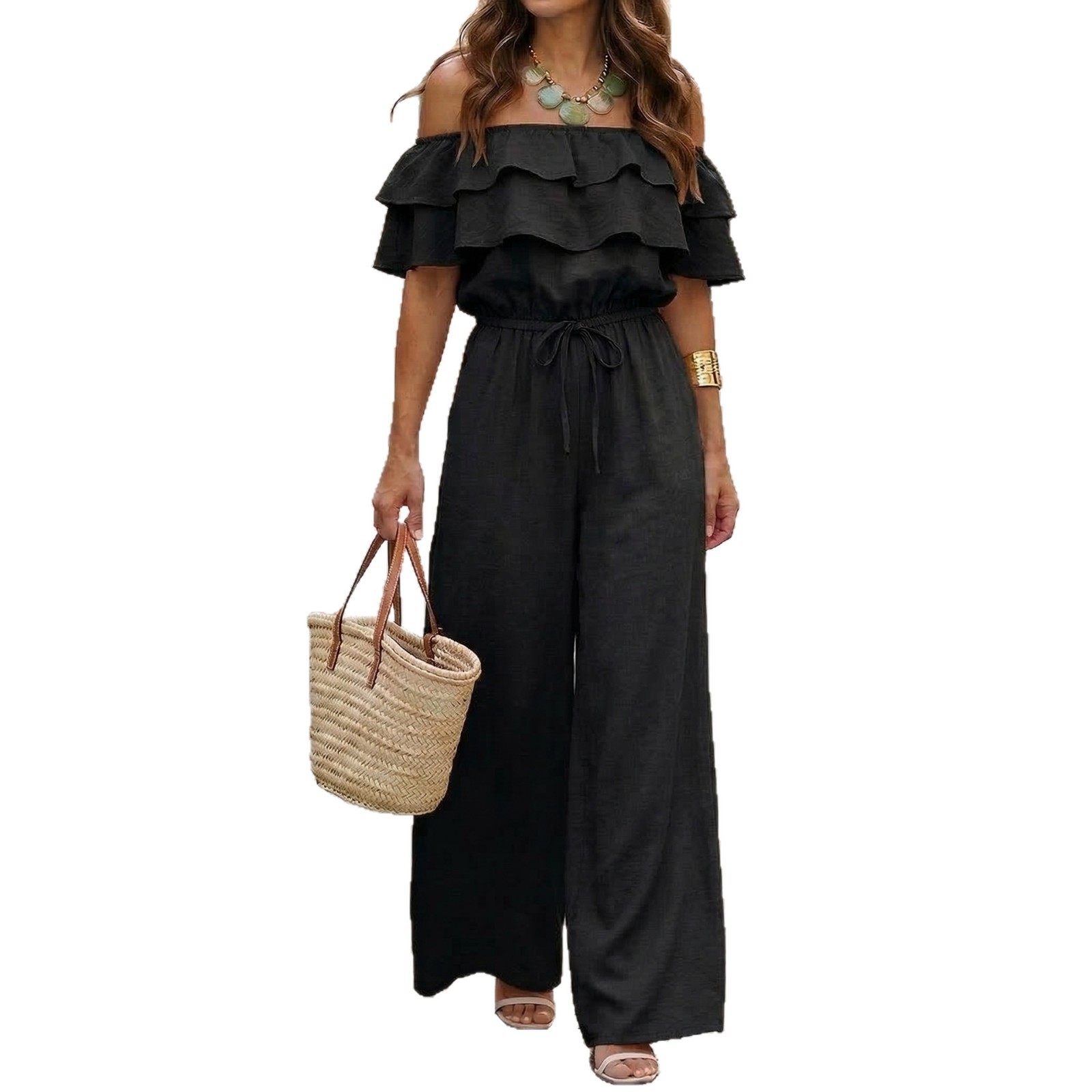 Womens Ruffled Off-Shoulder Solid Color Cinched Waist Jumpsuit is designed for style, comfort, and everyday use.