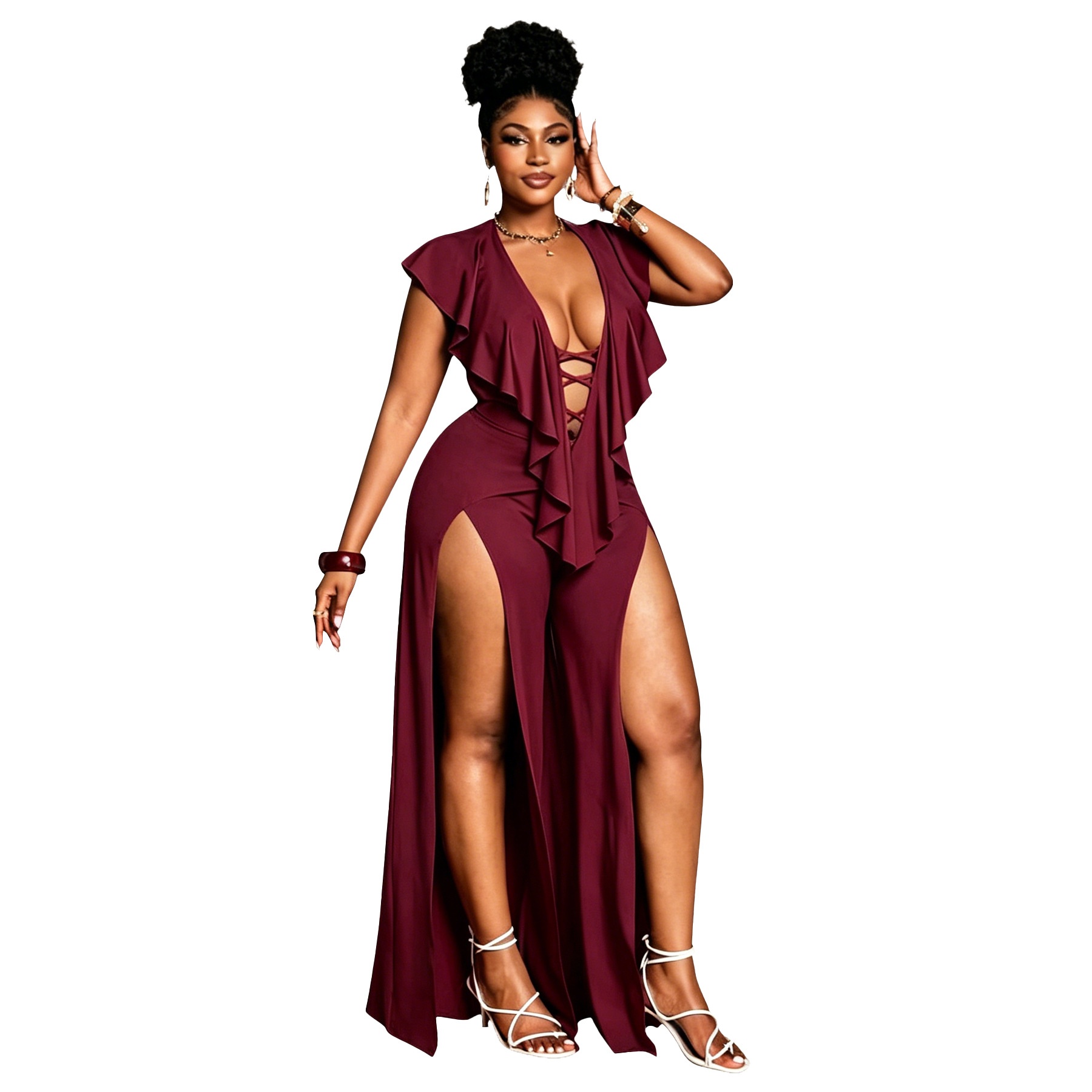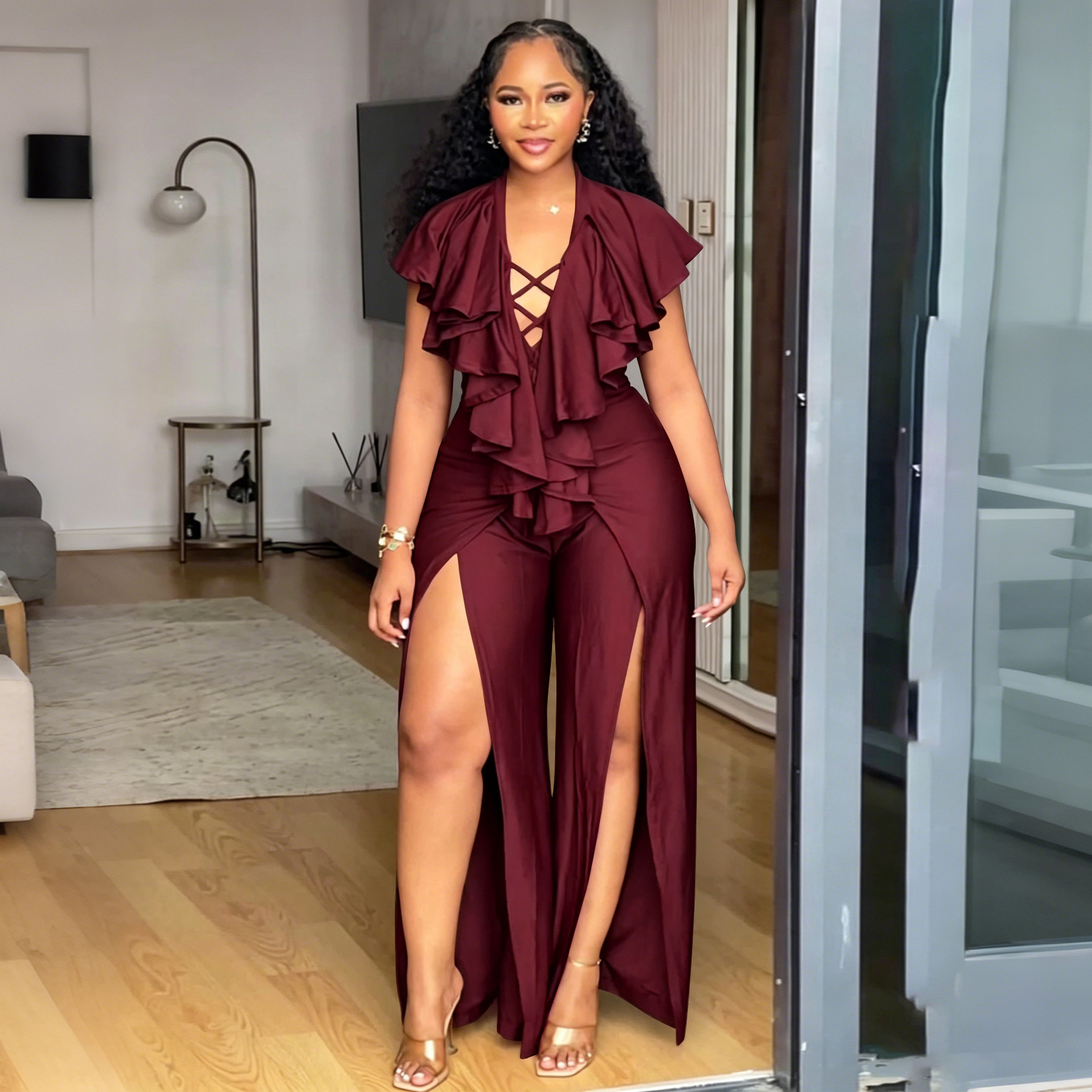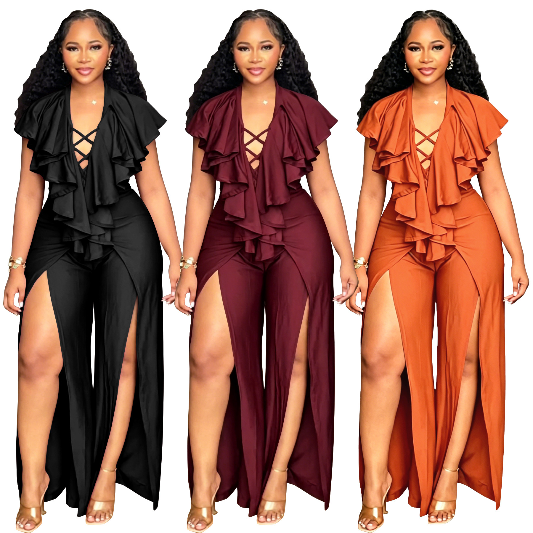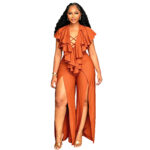 Womens Summer Ruffle-trimmed Wide-leg Split Jumpsuit is designed for style, comfort, and everyday use.