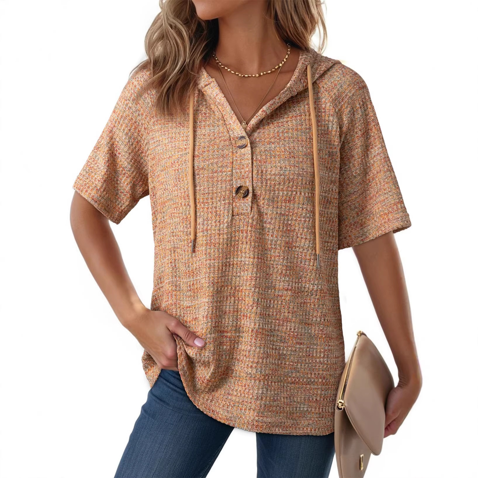 Womens Waffle-Weave Buttoned V-Neck Hoodie With Drawstring