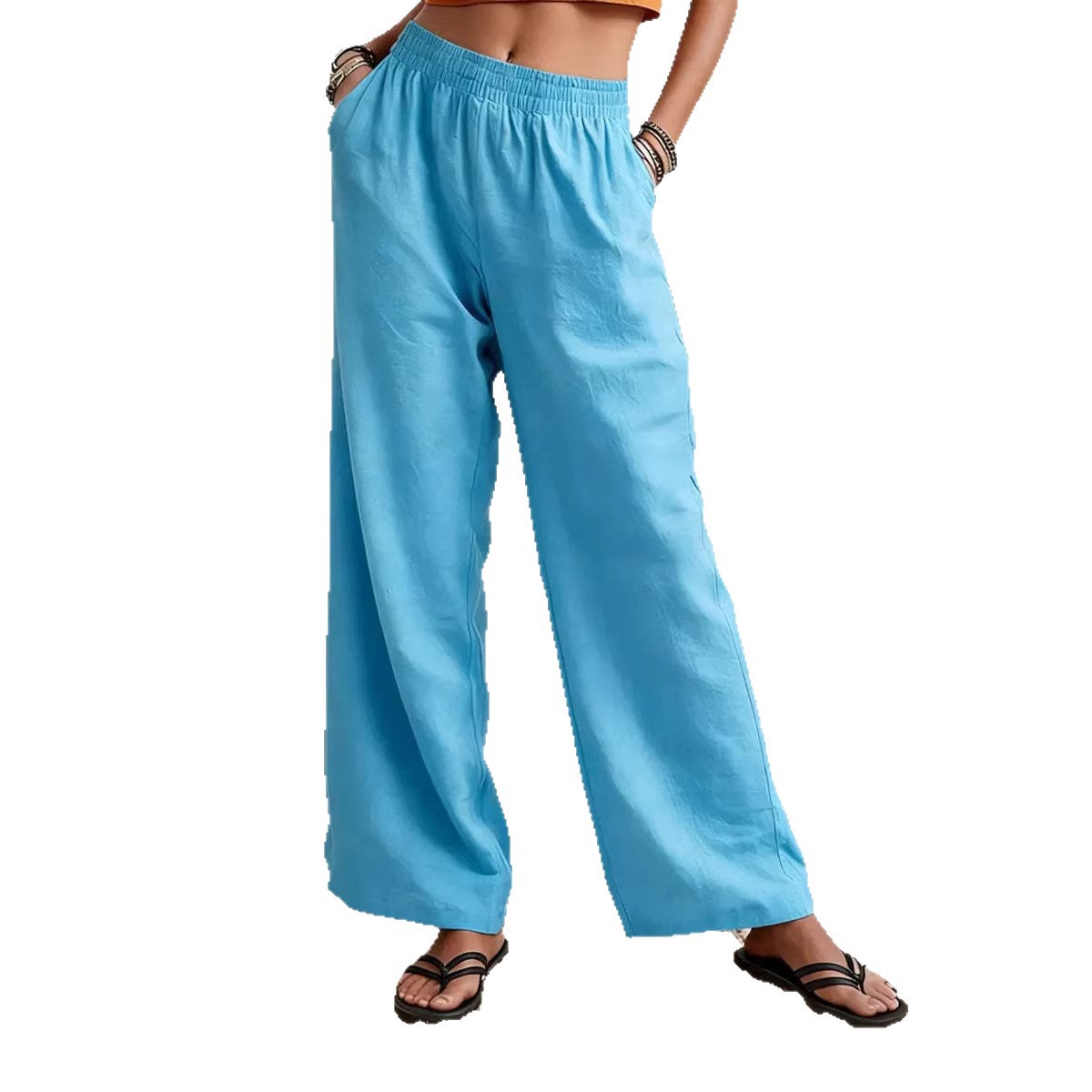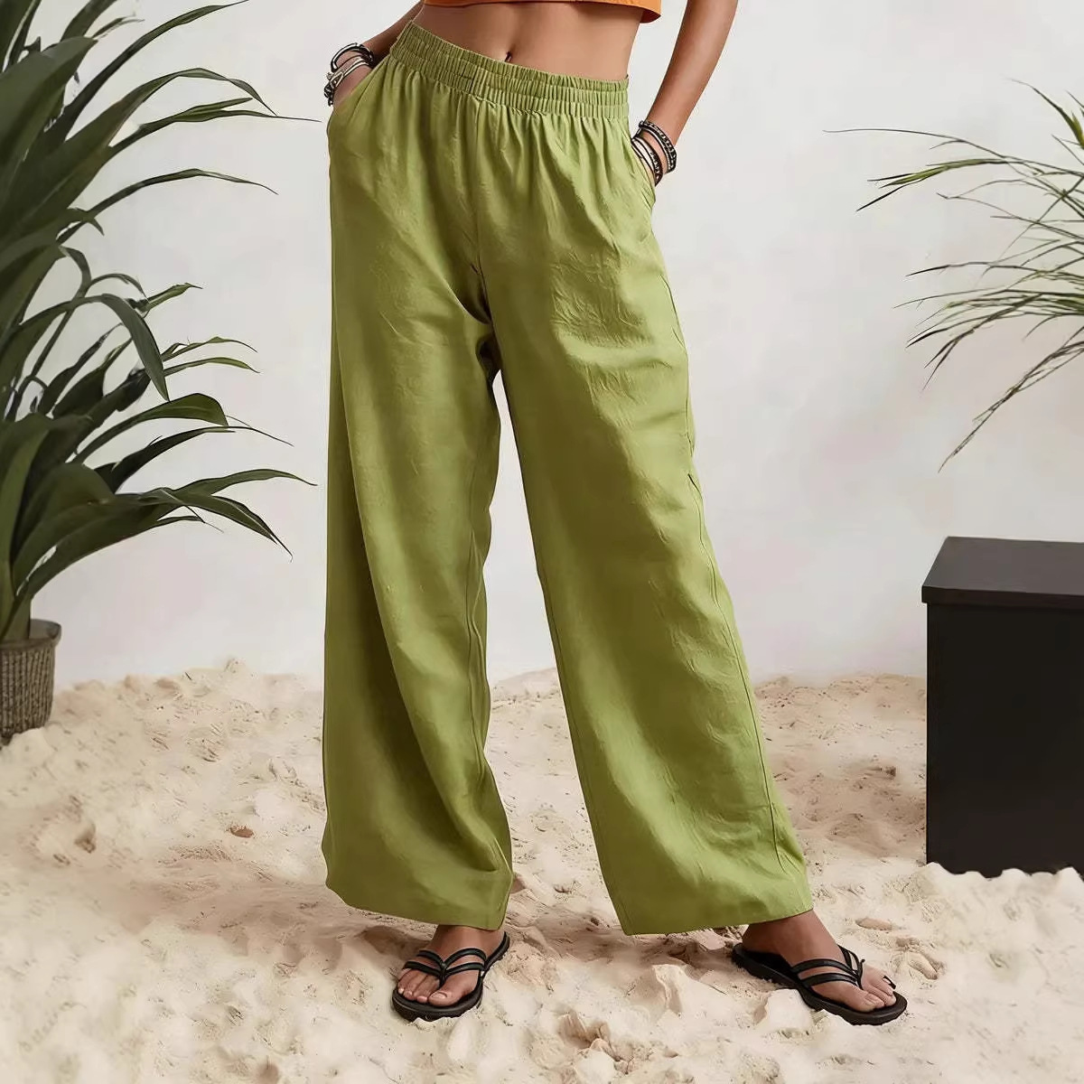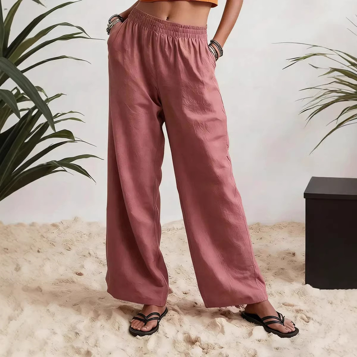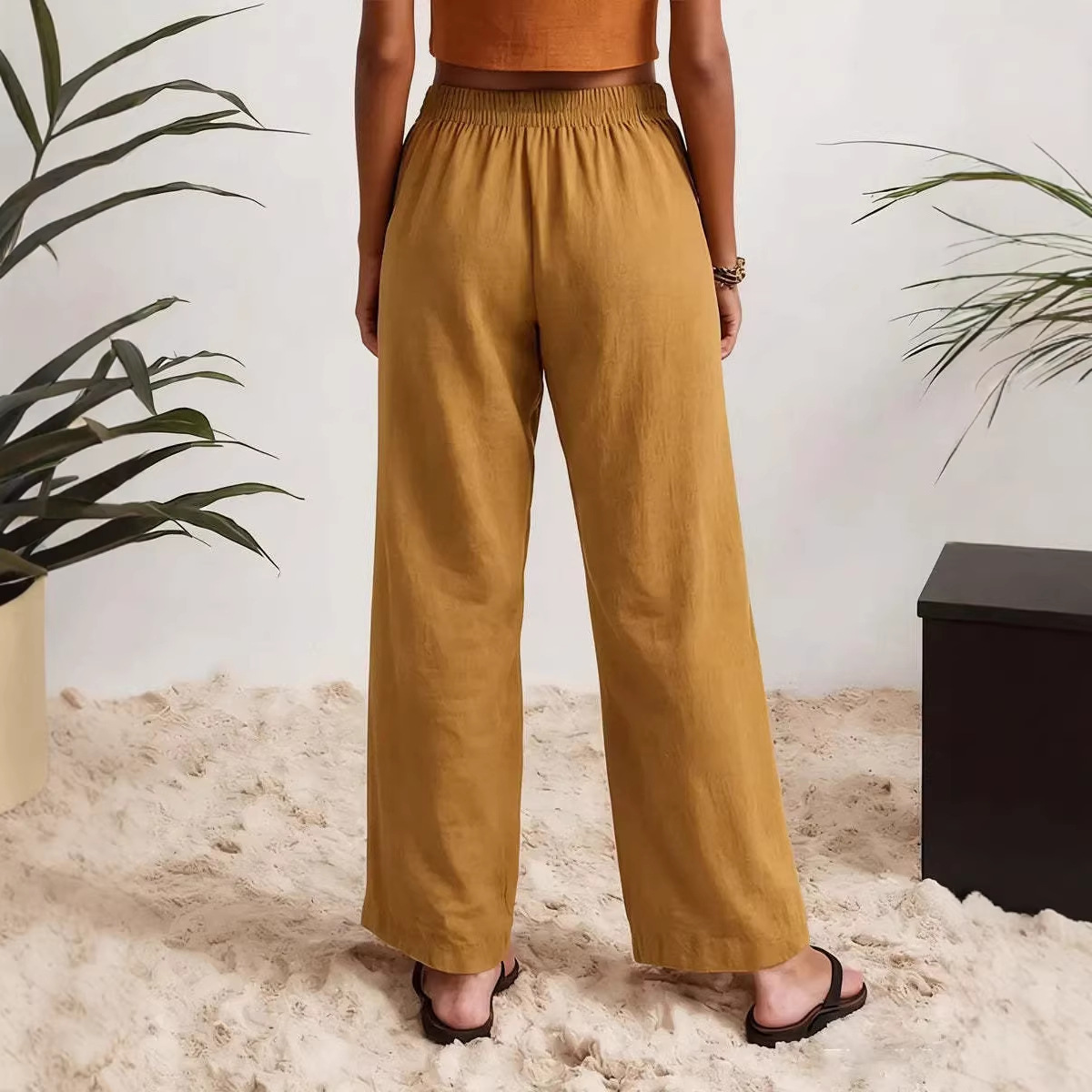 Womens Wide-leg Pants Comfortable Cotton-linen Blend Solid Color Fashionabl