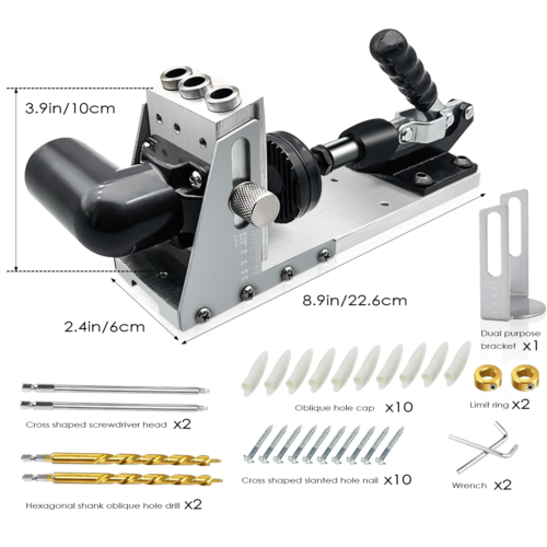 • 【Package Includes】【Package Includes】1 x pocket hole jig, 2 x 9.0mm drill bits, 1 x dual purpose bracket, 2 x square head drills, pocket hole screws and 10 x hole plugs, 2 x drill stop rings and 2 x spanner spanner.